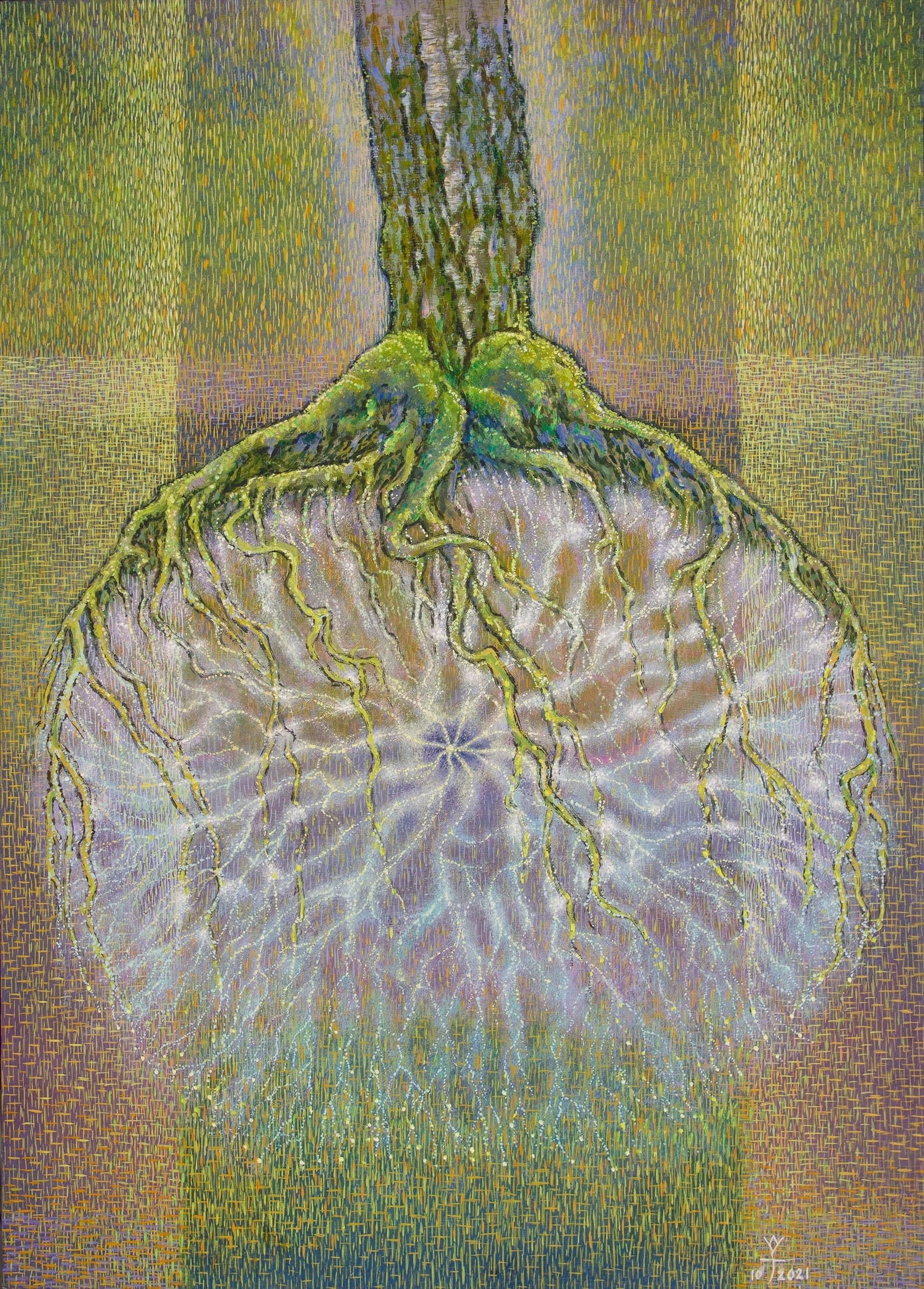 10 November 2021: Gisteren viel me tijdens een wandeling langs de Geleenbeek een oude eik op die ik nog niet eerder had gezien. Ik liep ernaar toe, legde mijn hand tegen de stam en bewonderde zijn machtige kroon en liep vervolgens weer verder. Vannacht voelde ik urenlang warmte, en vanaf zes uur ervoer ik aanzwellende en afnemende vibraties in mijn onderlijf…Blijkbaar geeft de eik de overvloed van energie van de plek waarop hij groeit aan mij door - een wonderlijke vorm van contact.