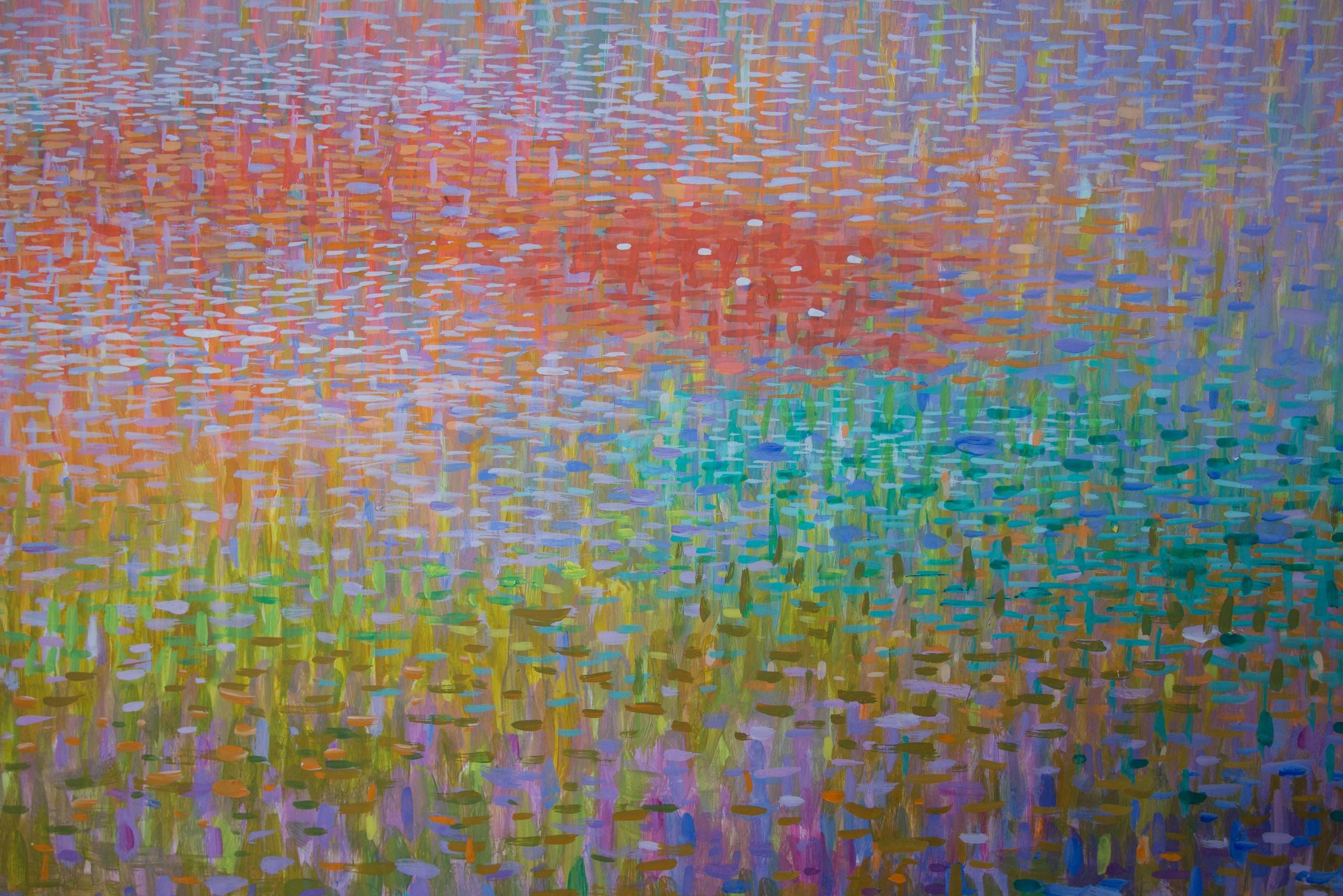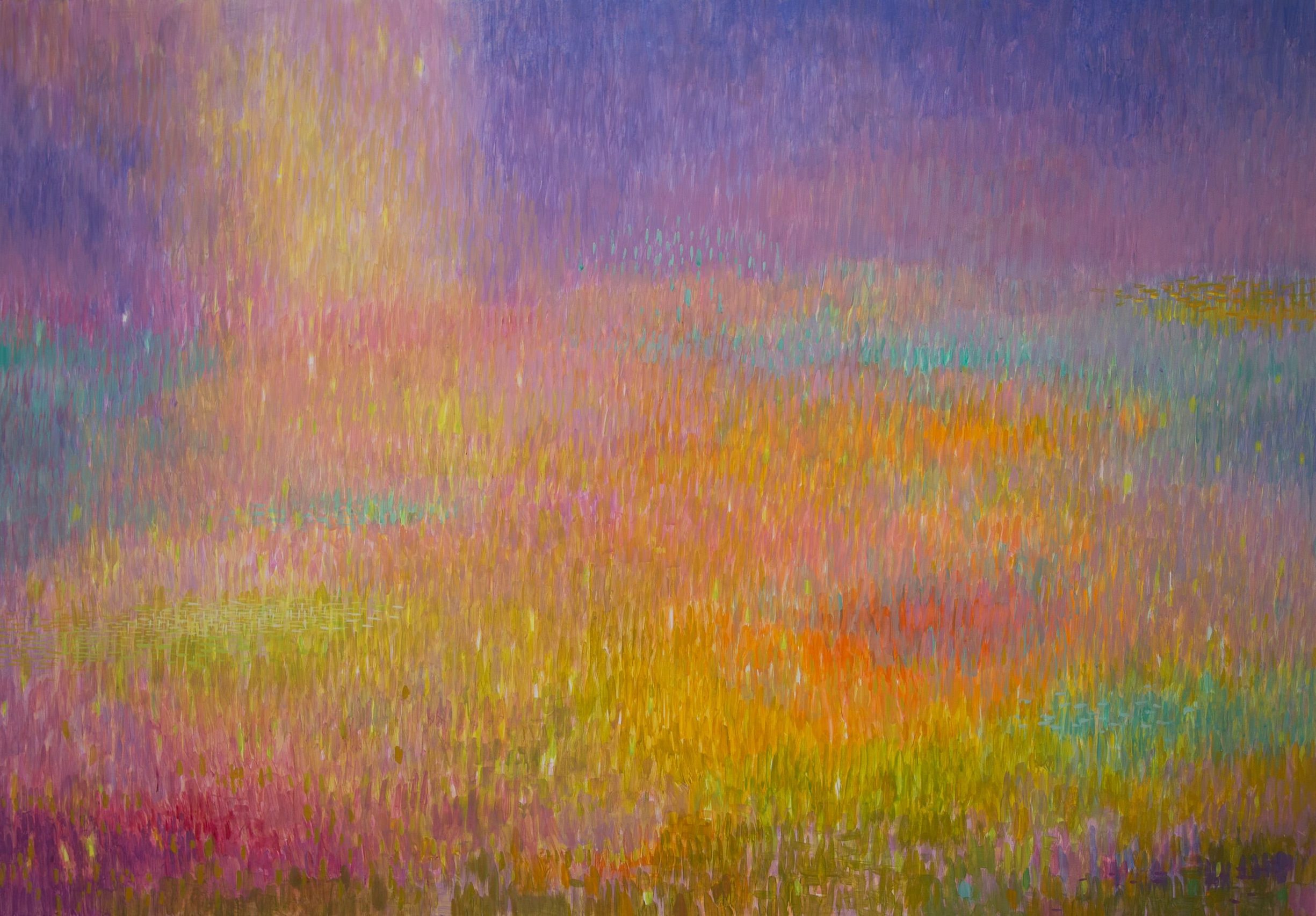 In elk geval is het ook een abstractie opgebouwd uit verticale en horizontale kleurpartikels. De heldere kleuren van de eerste (verticale) lagen vergrijs ik met de daarop volgende (horizontale) lagen. Het beeld verstilt op enkele vonken na die opgloeien uit de ondergrond en één donkerblauw accent.