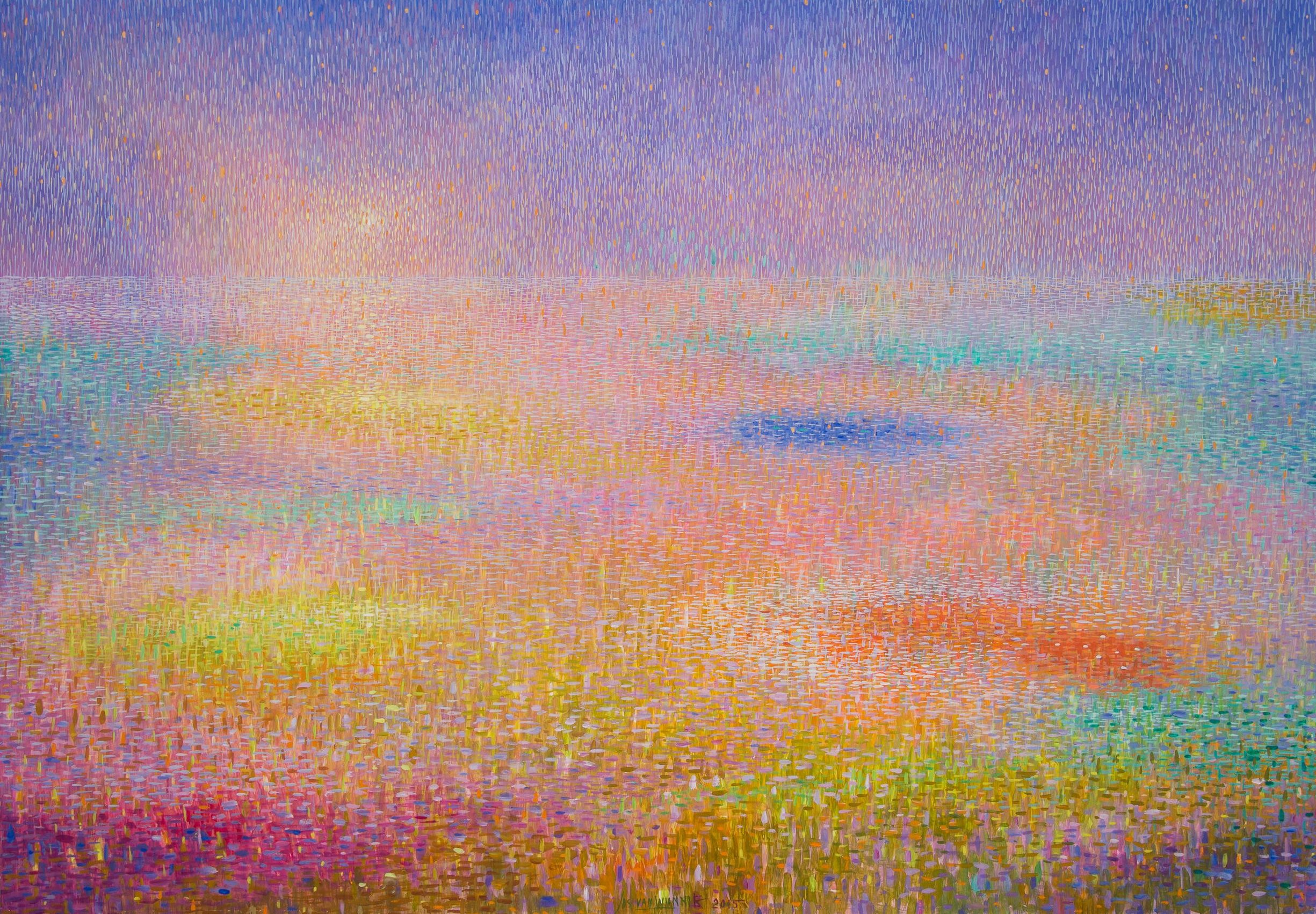 In de nog ongedifferentieerde, abstracte kleurruimte ontstaan lichtplekken, eilandjes van stralende kleuren.