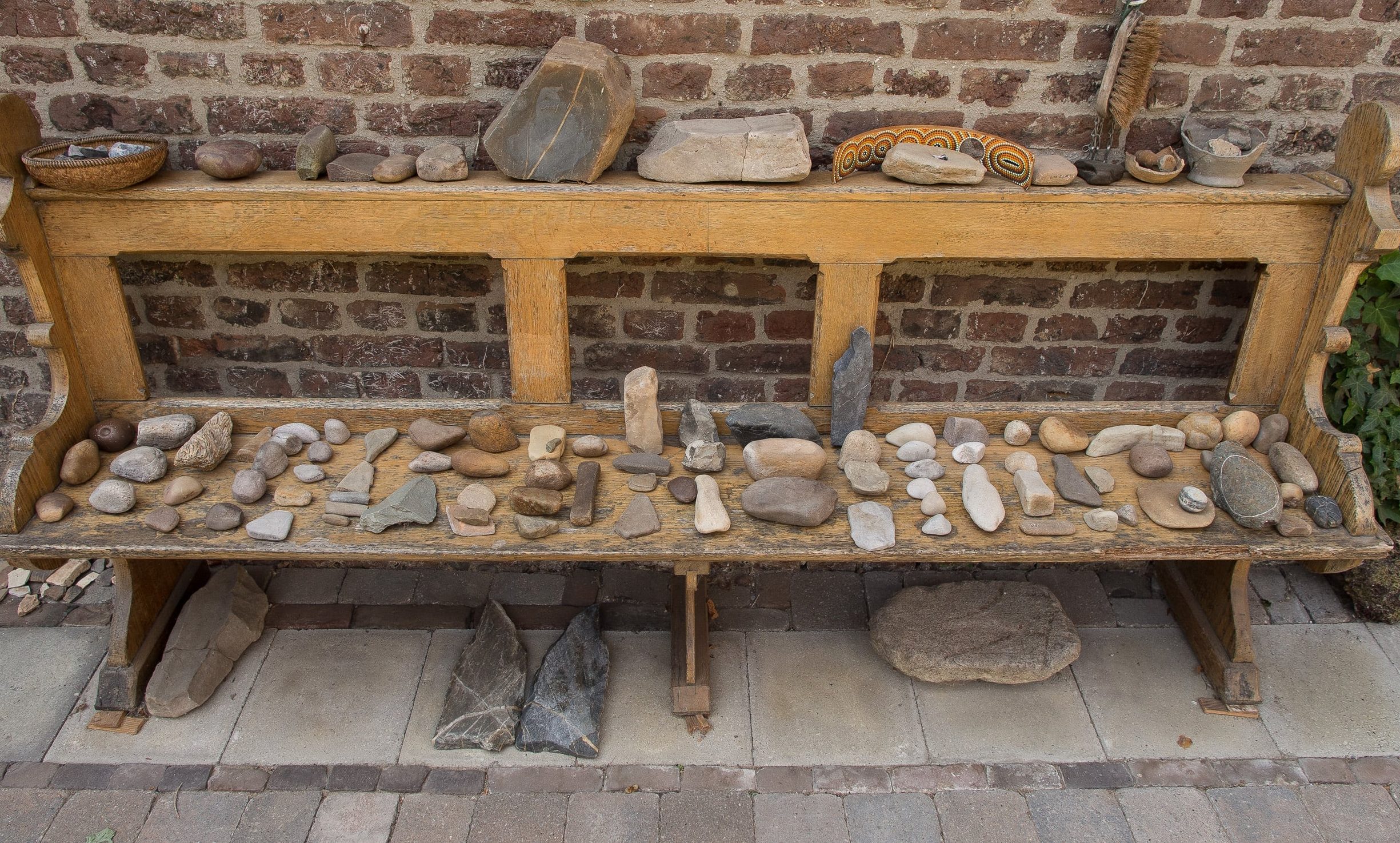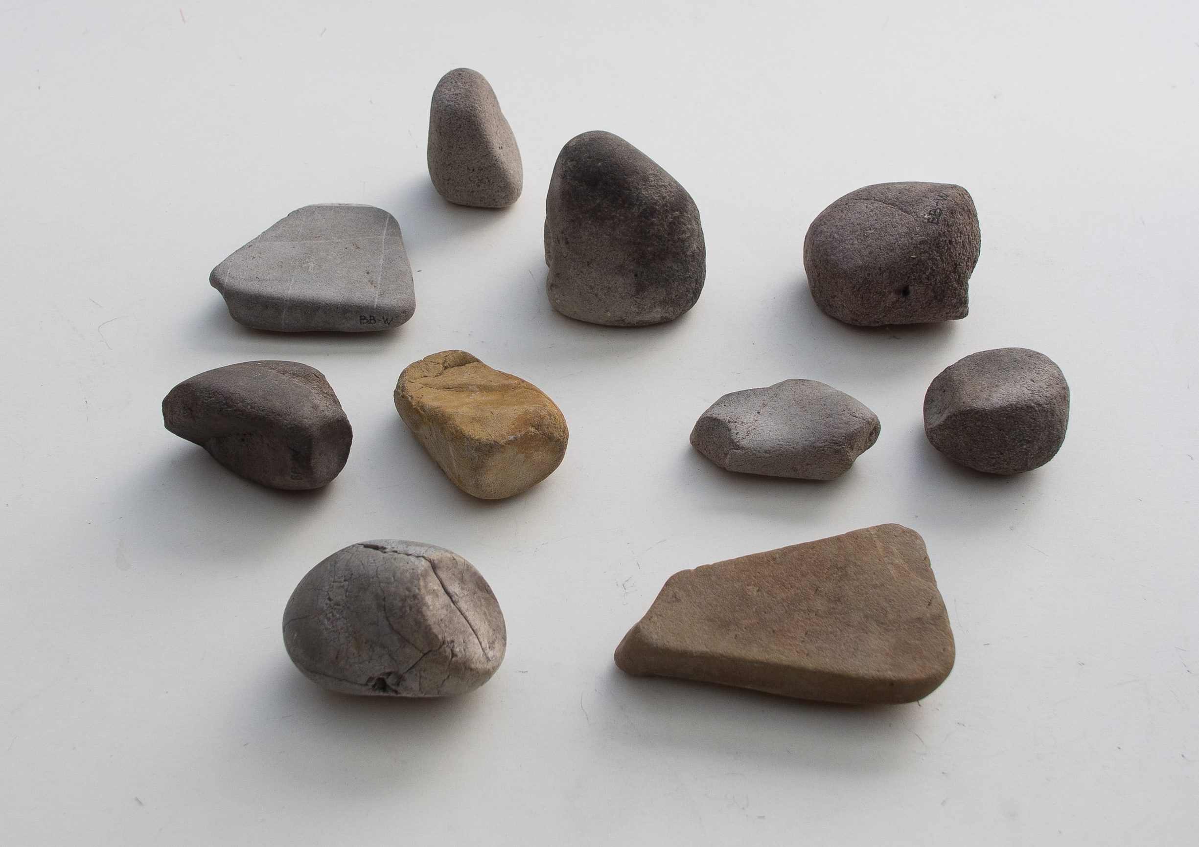 7 Juni 2018: Op een broeiend warme dag rijdt ik met een vriend naar de golfbaan en vandaar lopen we over de Brandenberg. Geen mens te zien hier. Ook hij is verbaasd over de serene rust die de Brandenberg in deze drukke omgeving uitstraalt. Langs het pad aan de westkant valt me nu een lange greppel op, die bovenaan de helling bij een bergje ophoudt. Naast het bergje is een plek met veel stenen. Al gauw valt mijn oog op een merkwaardig donkergrijs gepatineerde steen met een cirkelvormige, enigszins uitgeholde onderkant. Vervolgens vind ik nog drie stenen (3), misschien gebruikt voor het fijnwrijven van kruiden? Was hier ooit een werkplaats van iemand, die in het bergje is begraven, samen met haar stenen gereedschap?