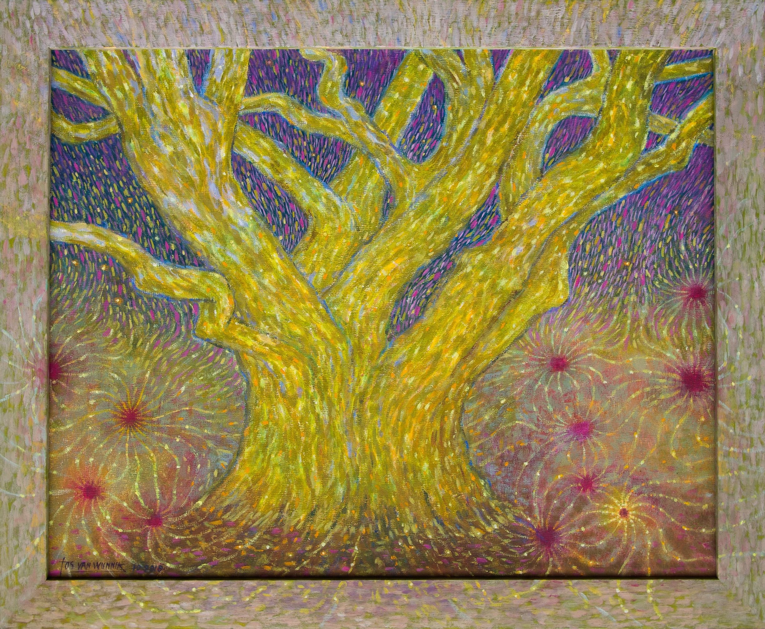 Ik zit deze keer langer in de door de laag vertakte stam gevormde zetel. Het ruisen en razen in de verte rondom, verdwijnt al gauw naar de achtergrond als er voor mijn gesloten ogen een zacht groen veld (lichtgroen met roze) verschijnt, een dieproze duister daaronder, en heel even, een ronde paarse band daar tussenin. Hoe zou het zijn om het als mens net als een boom met één plek te moeten doen? Ik realiseer me dat mijn actieradius ondanks mijn lopen en reizen in wezen niet groter is dan de reikwijdte van mijn geest, en van de verbinding met al het leven dat mij omringt. Daarna geniet ik van de golfbaan en van de koffie in het restaurant, iedereen zegt me vriendelijk goeiedag.