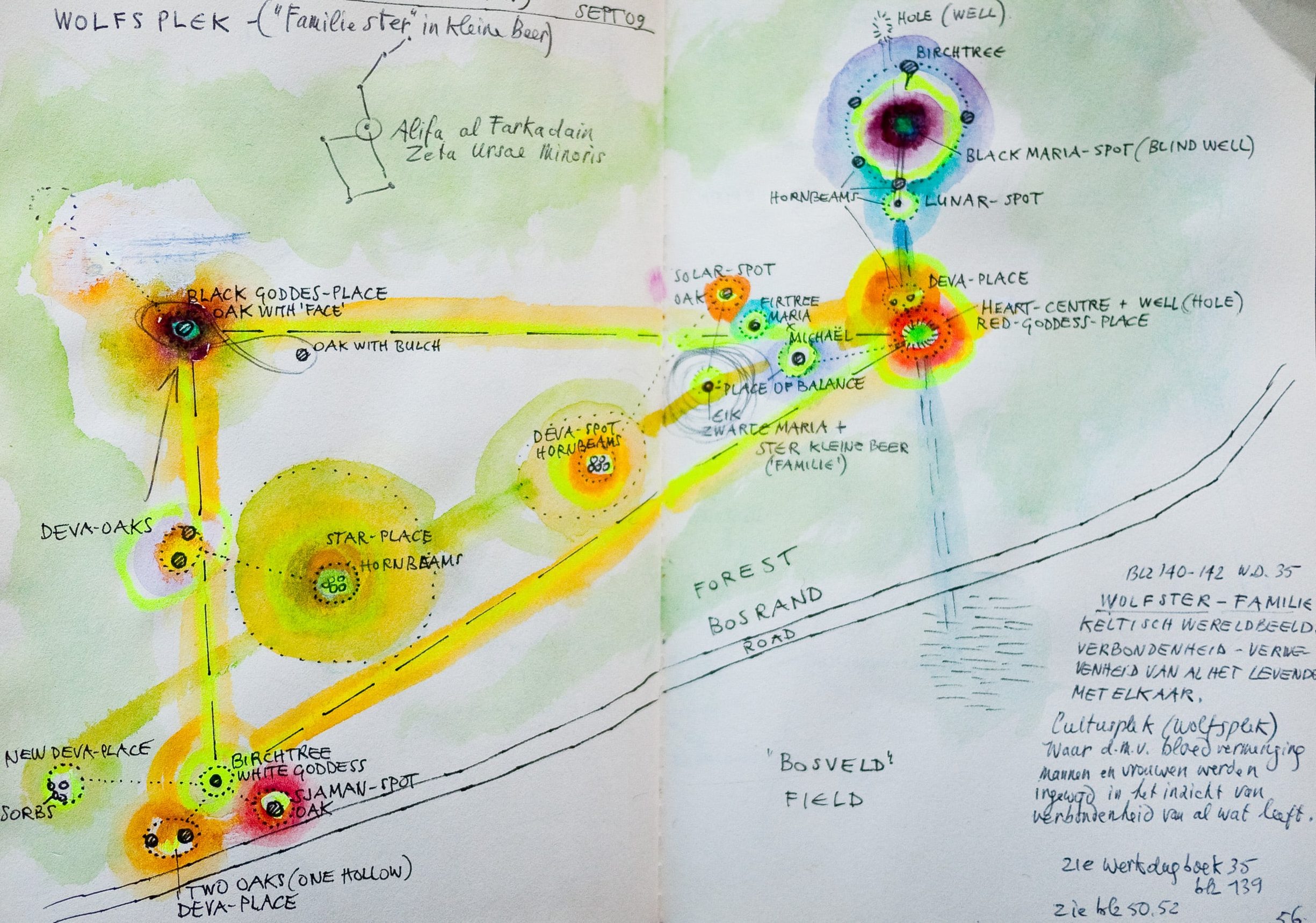 Verder noem ik de slangenlijnen en de Zwarte Mariaplek, omdat deze het meest zichtbaar inwerken op de groeivormen van bomen; de Lunarplek en Solarplek, de Michaëlplek en Mariaplek (yin-yang/mannelijk-vrouwelijk); de Elementenwezens-plek; de plek van Evenwicht (tussen yin-yang) en tot slot — en tevens de rode draad in dit project — de plek van Verbinding (de versmelting van polariteiten).