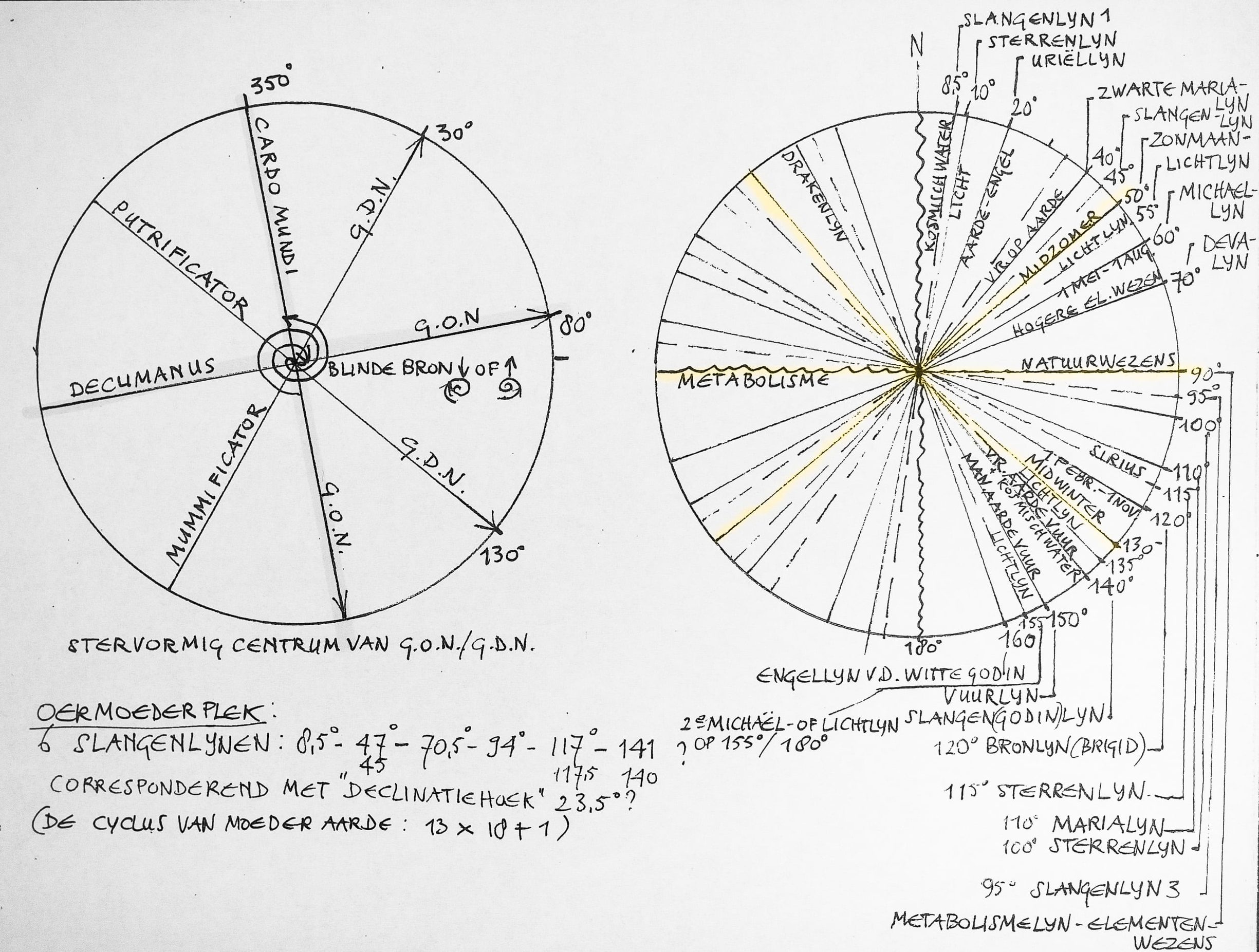 In 2004 kon ik 40 verschillende levens-energetische kwaliteiten met behulp van de wichelroede opsporen. Ik maak echter al jarenlang geen gebruik meer van deze wonderlijke methode omdat het me teveel belastte, en omdat in mijn geval het (onder)zoeken teveel het ondergaan in de weg zat. Tevens zag ik in dat het onderzoeken van dit complexe kennisgebied mijn vermogen te boven gaat, en dat de tijd nog niet rijp is om met anderen tot overeenstemming m.b.t. de terminologie te komen. Het onderstaande schema is daarom een van de vele mogelijke invalshoeken.