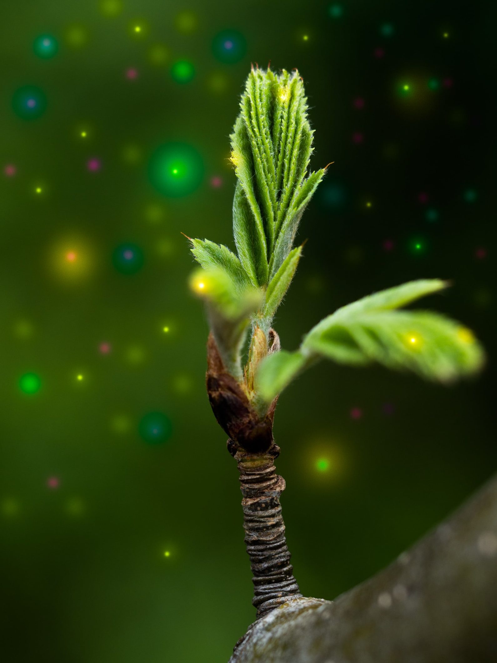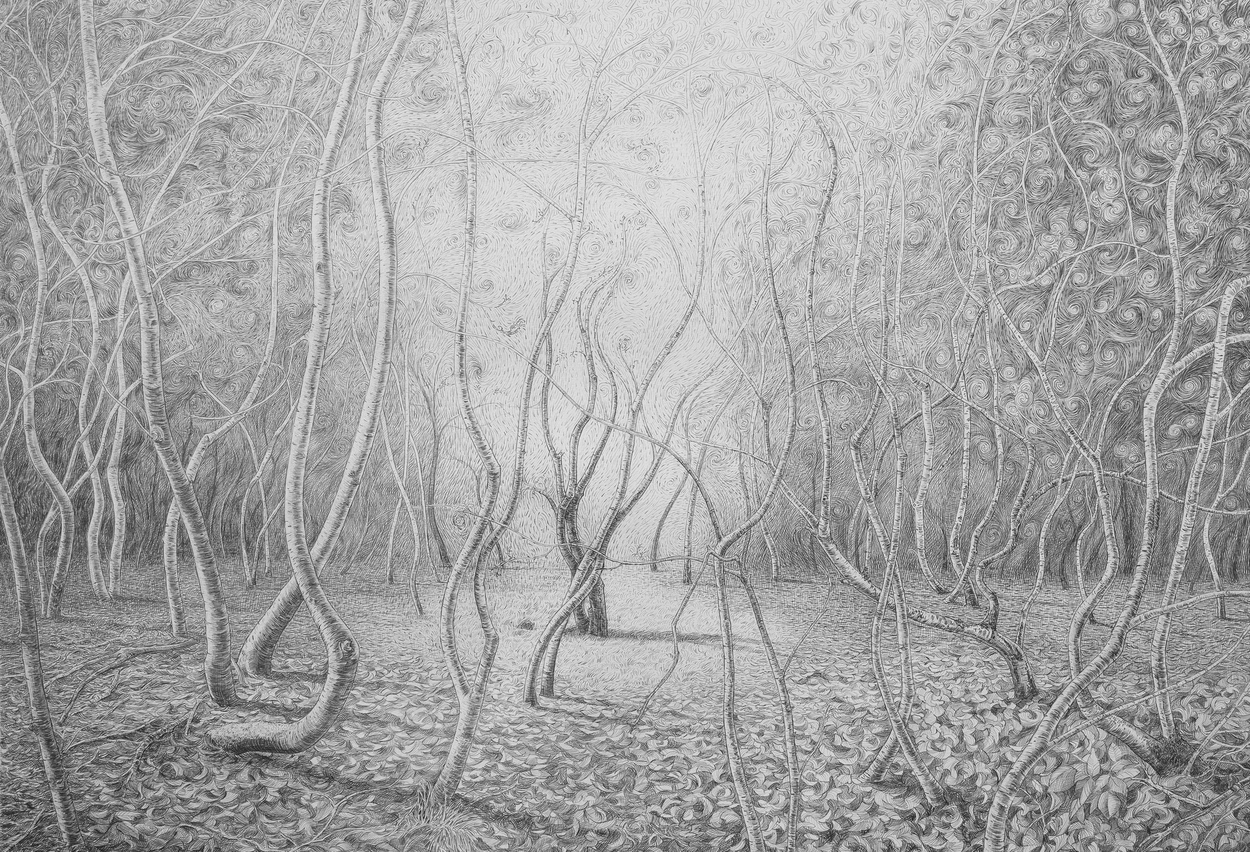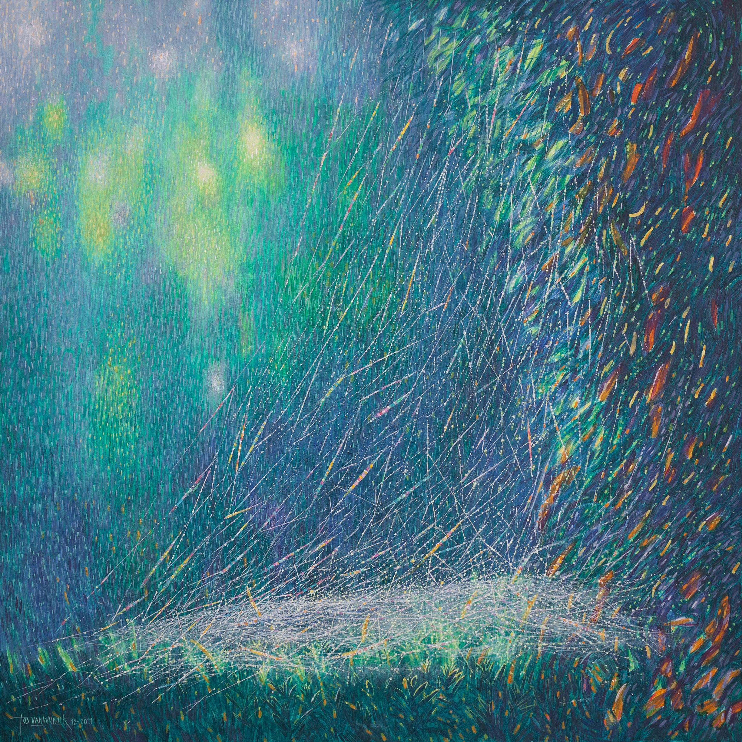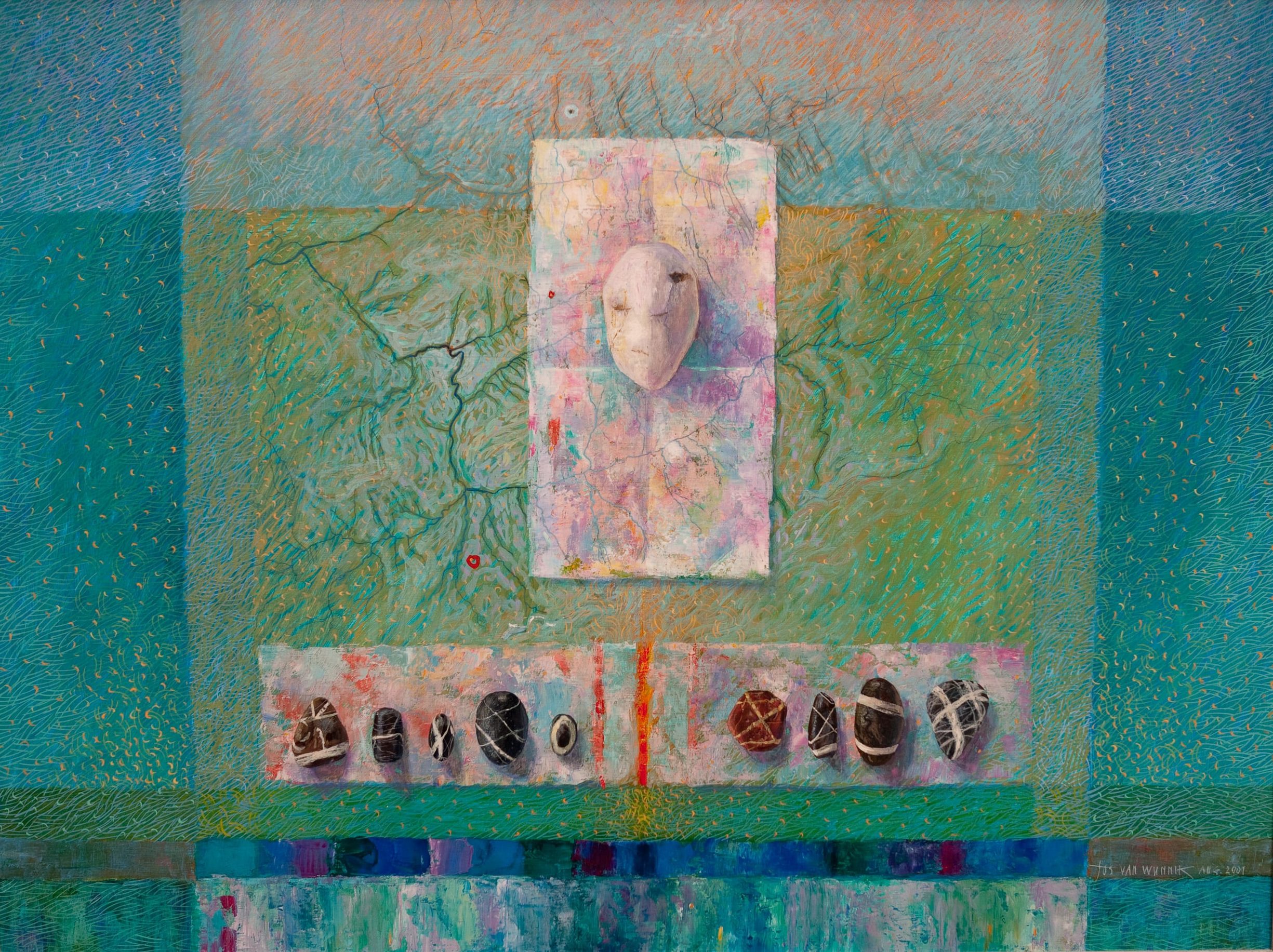 De Witte-groeiplek is samengesteld uit o.a. een Witte-plek en een Groene-stroomplek. Deze ‘groene stroom’ blijkt een centraal gegeven te zijn in mijn kunst. Is dit het beeld — een eindeloze lente-achtige stroom van groei — dat de verborgen drijfveer is achter al mijn zoeken? Voor mij is het de tijdloze uitwisseling tussen natuur, de zich steeds vernieuwende cyclus van groei en verval, en het eenheidsveld.