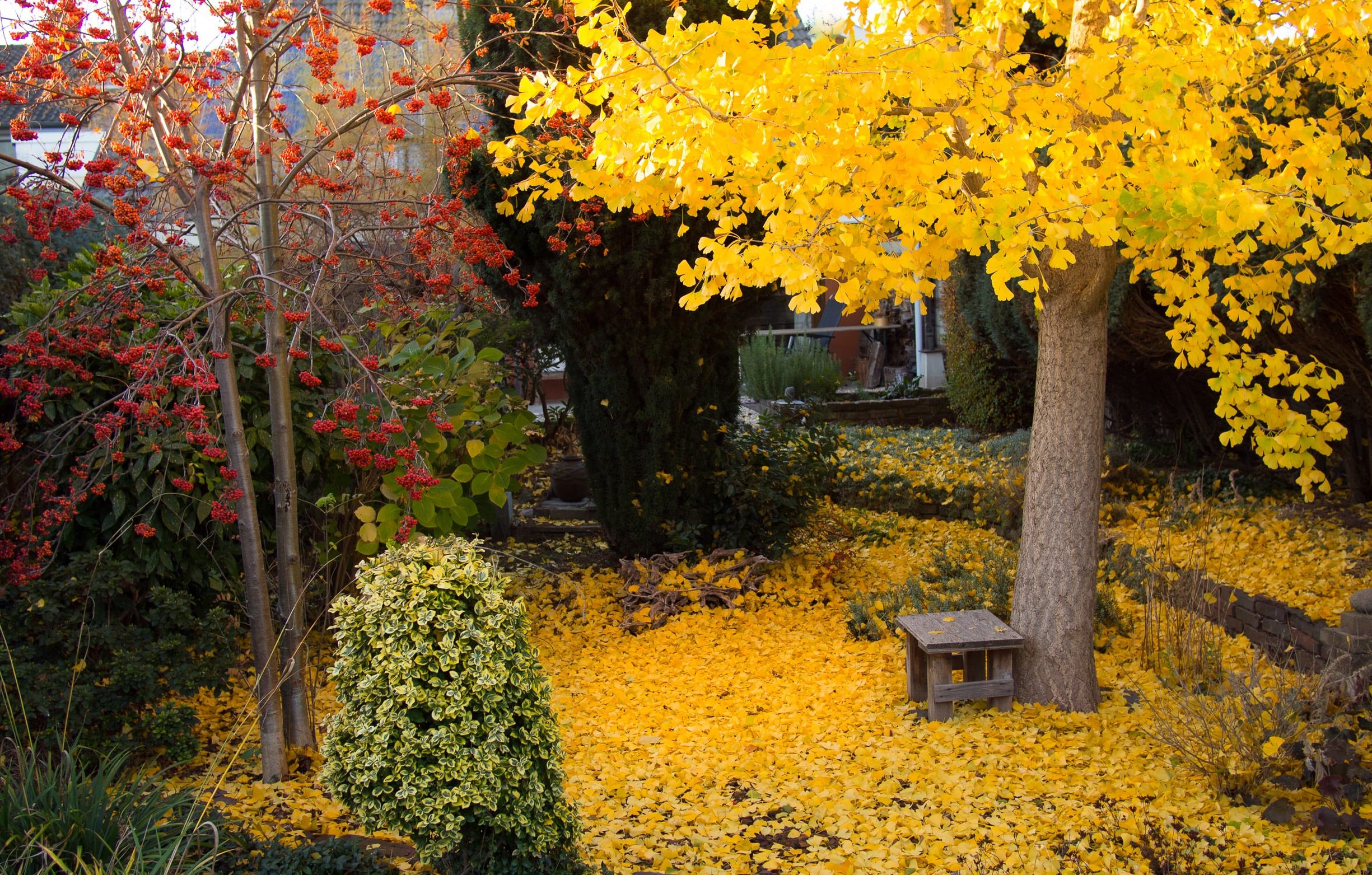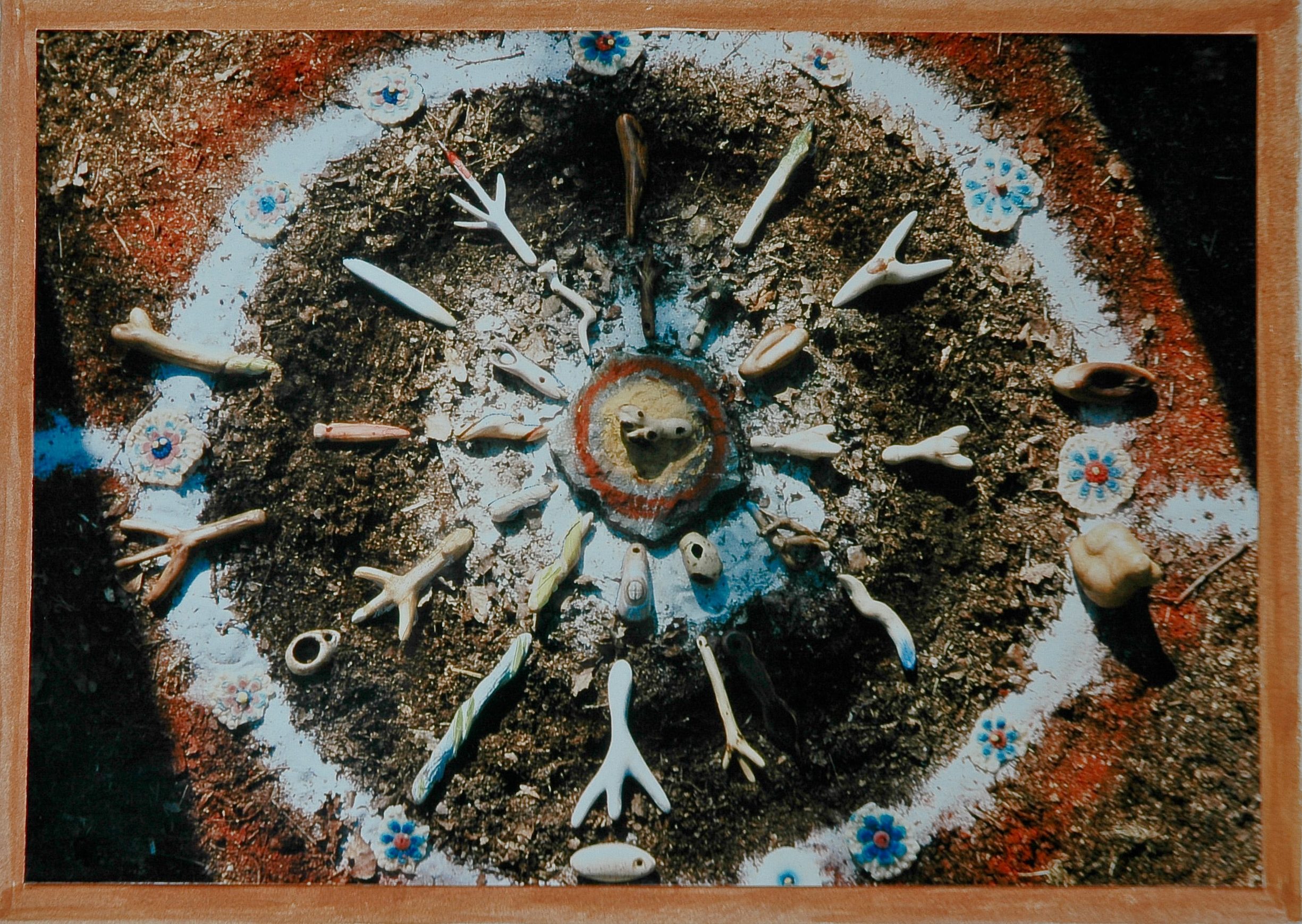 Het toeval wil dat zich pal achter mijn atelier dezelfde Witte-groeiplek bevindt als op het bergje bij de samenvloeiing in het op enkele honderden meters verder gelegen Leiffenderven. Op de Witte-plek in het centrum staat een Ierse taxus, die ik cadeau kreeg van mijn vader. Hij staat in een cirkel met een grindpaadje rondom. Een forse ginkgo, die ik ooit van mijn broer kreeg, staat naast de cirkel op een Rode-plek. Een conifeer markeert de Zwarte-plek. De twee-stammige lijsterbes, die aan de andere kant van de Ierse taxus op een Deva-plek groeit, is uit zichzelf als een geschenk van de natuur hier gekomen. In de zomer van 2018 heb ik naast deze cirkel een tweede kring gemaakt onder de ginkgo en de lijsterbessen, die inmiddels mijn favoriete zitplek in de tuin is.