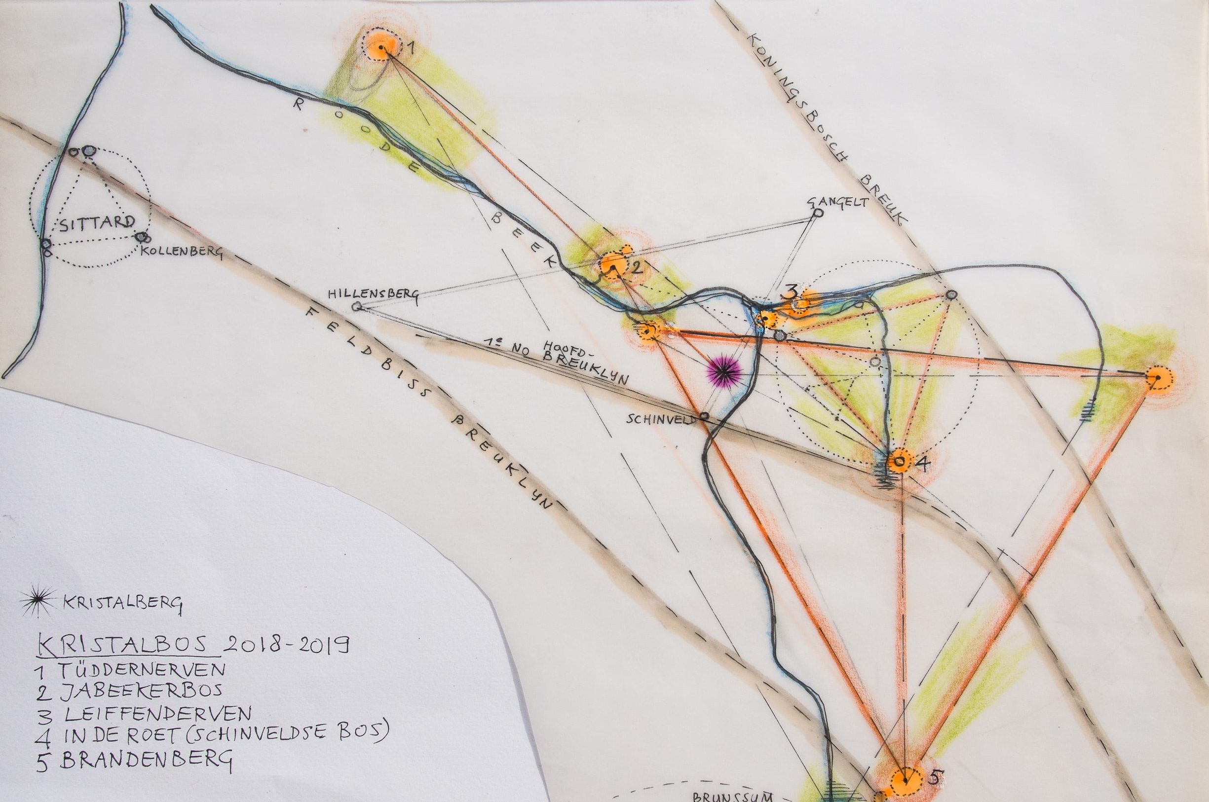 De dagboek-items met als titel ‘Kristalbos’ vormen een geheel en zijn onderdeel van een nieuw project. Sinds eind 2017 heb ik mijn onderzoek naar natuur en levensenergie uitgebreid van het Schinveldse Bos, dat me vele jaren inspireerde, naar zes andere bossen in een straal van ± 10 km rond mijn woonplek in Schinveld. Het Kristalbos-project omvat teksten, foto’s, plattegronden en schilderijen. In Kristalbos — Inleiding kan men algemene informatie vinden over dit project.