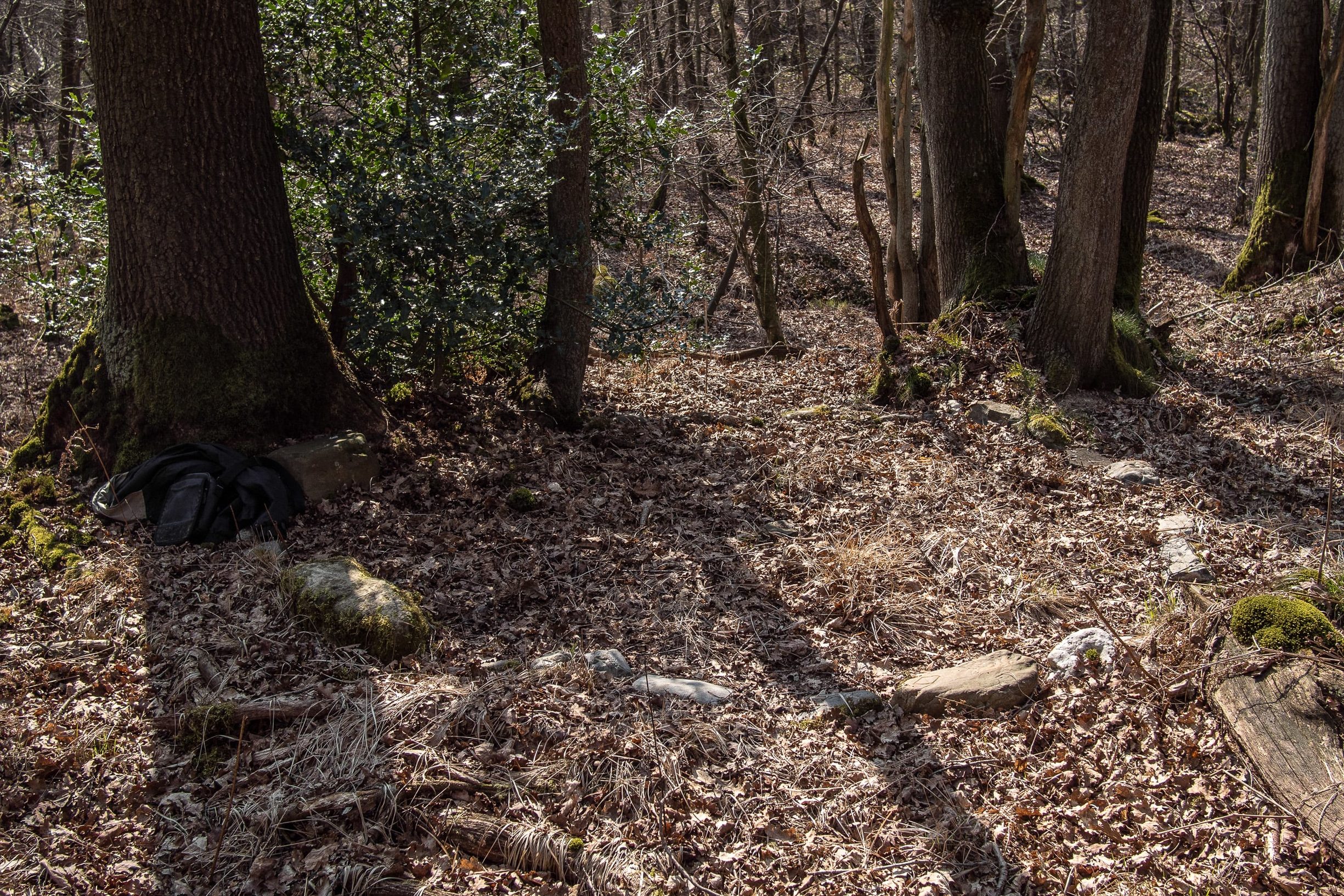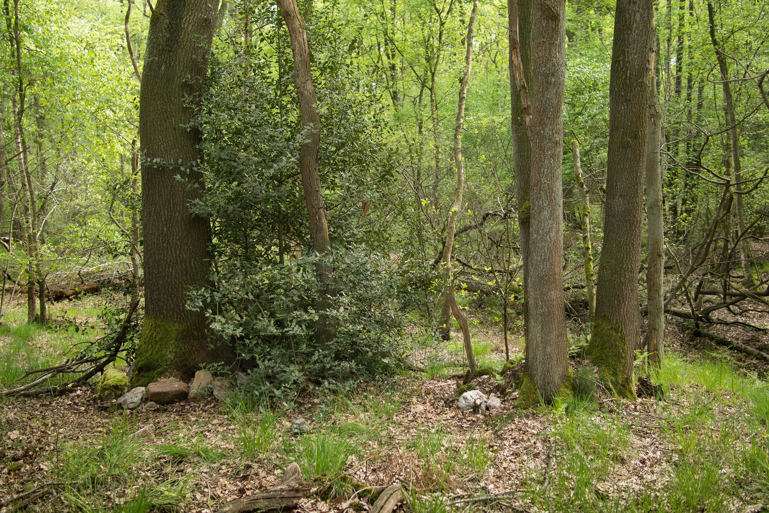 15 mei 2019: Vlakbij waar het bospad de Ruscherbeek kruist bevindt zich ook een hoekpunt gevormd door een wal en greppel. Hier legde ik in 1996 een kring van stenen (een van de vele kringen van takken of stenen die ik toen in de omgeving maakte) en ik plantte er een hulst naast een hoge eik met golvende stam. Ik noemde de plek ‘Ru’, afgeleid van rune, fluisteren. Maar daarna gaf ik de plek niet veel aandacht meer. De stenen liggen er nog steeds. Vandaag haal ik ze uit de grond en leg ze rondom de voet van de golvende eik. Dan blijf ik er een tijdlang zitten. In 1996 had ik amper rust om hier in stilte te zitten, en ik had ook niet genoeg aan één plek.