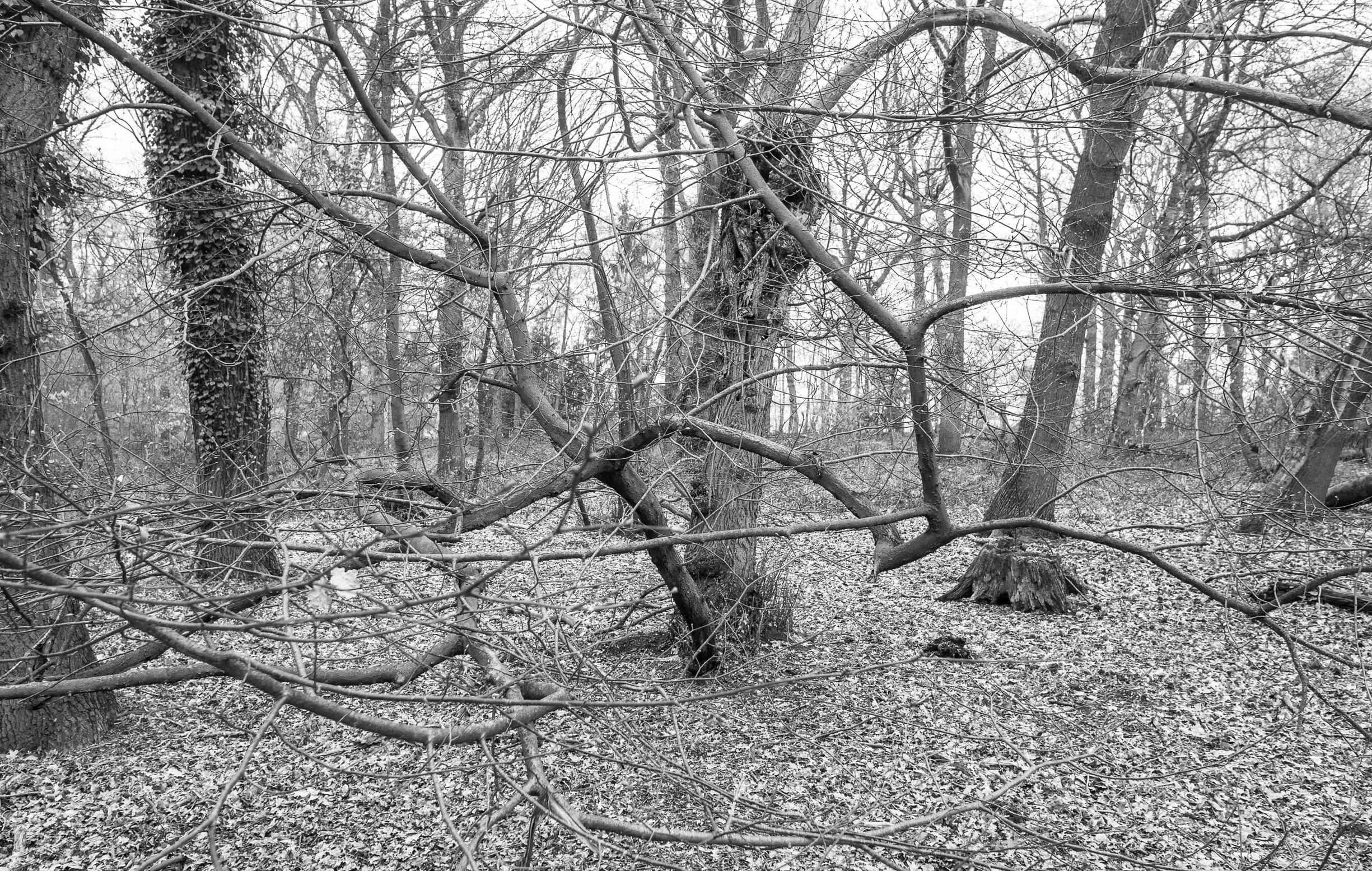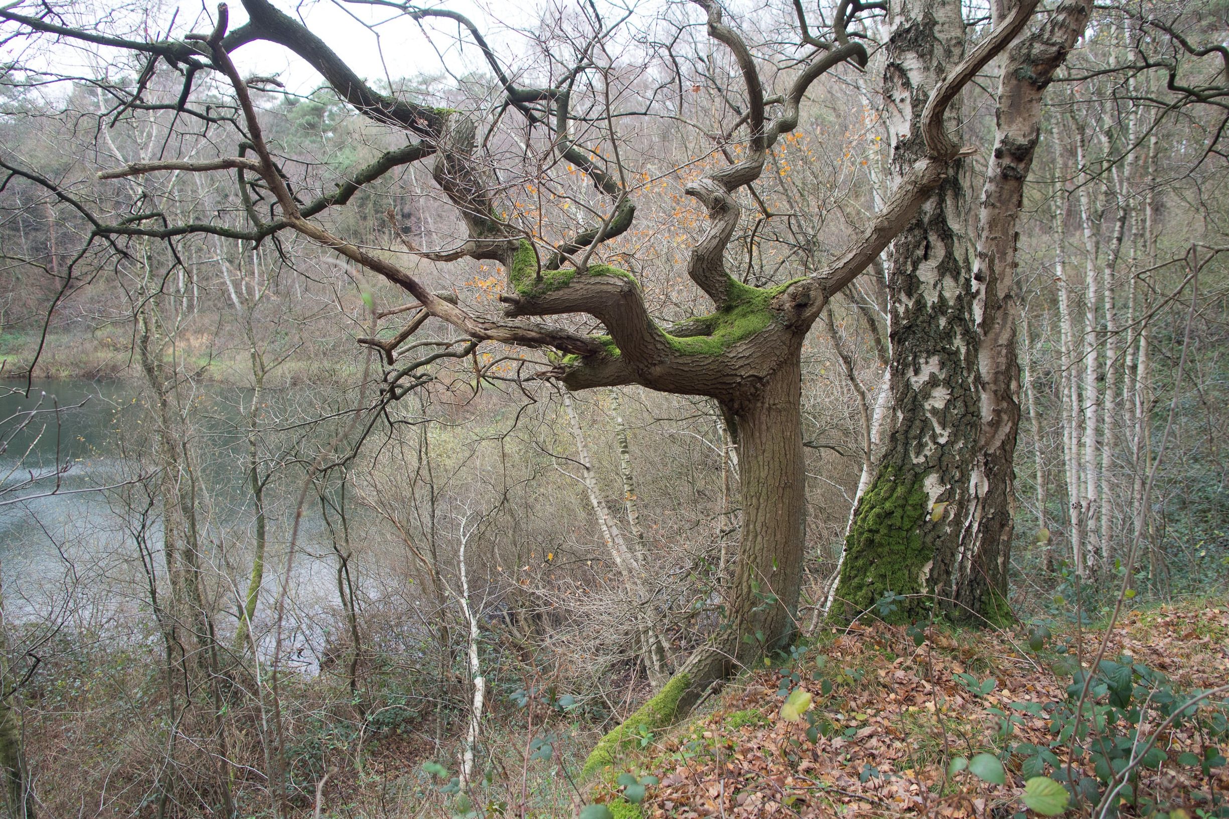 26 september 2017: “Ik bezoek het bos voor de tweede keer, maak foto’s en een krabbeltje van de lindeboom. Vanaf de linde loop ik dan verder naar de westelijke bosrand waar ik nog meer oude eiken naast grote kuilen vind. In een kuil lokaliseer ik de Zwarte-plek. Als ik daarna verder door het bos in oostelijke richting loop passeer ik aan de rand van de visvijvers een mooie slangenlijn-eik.”