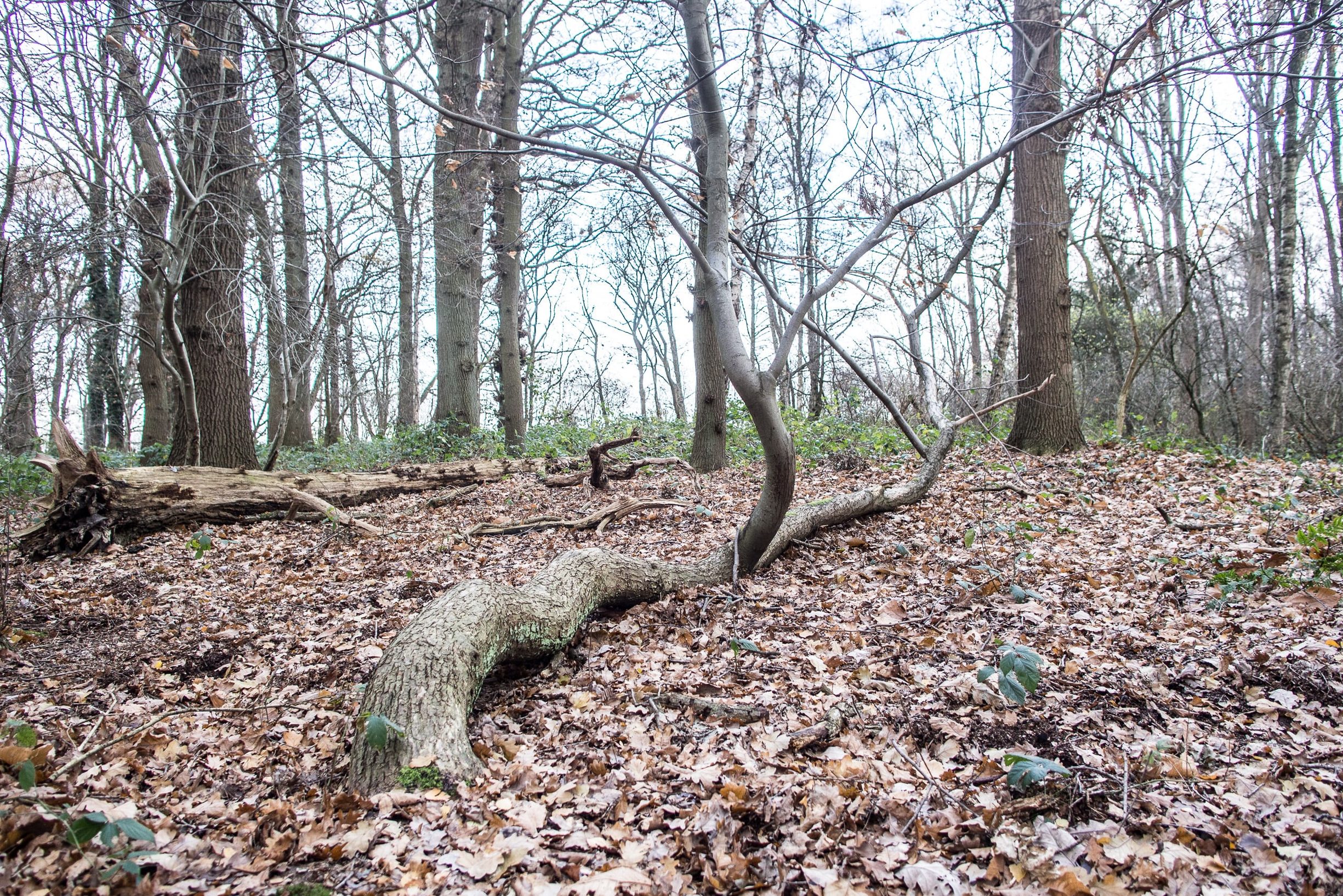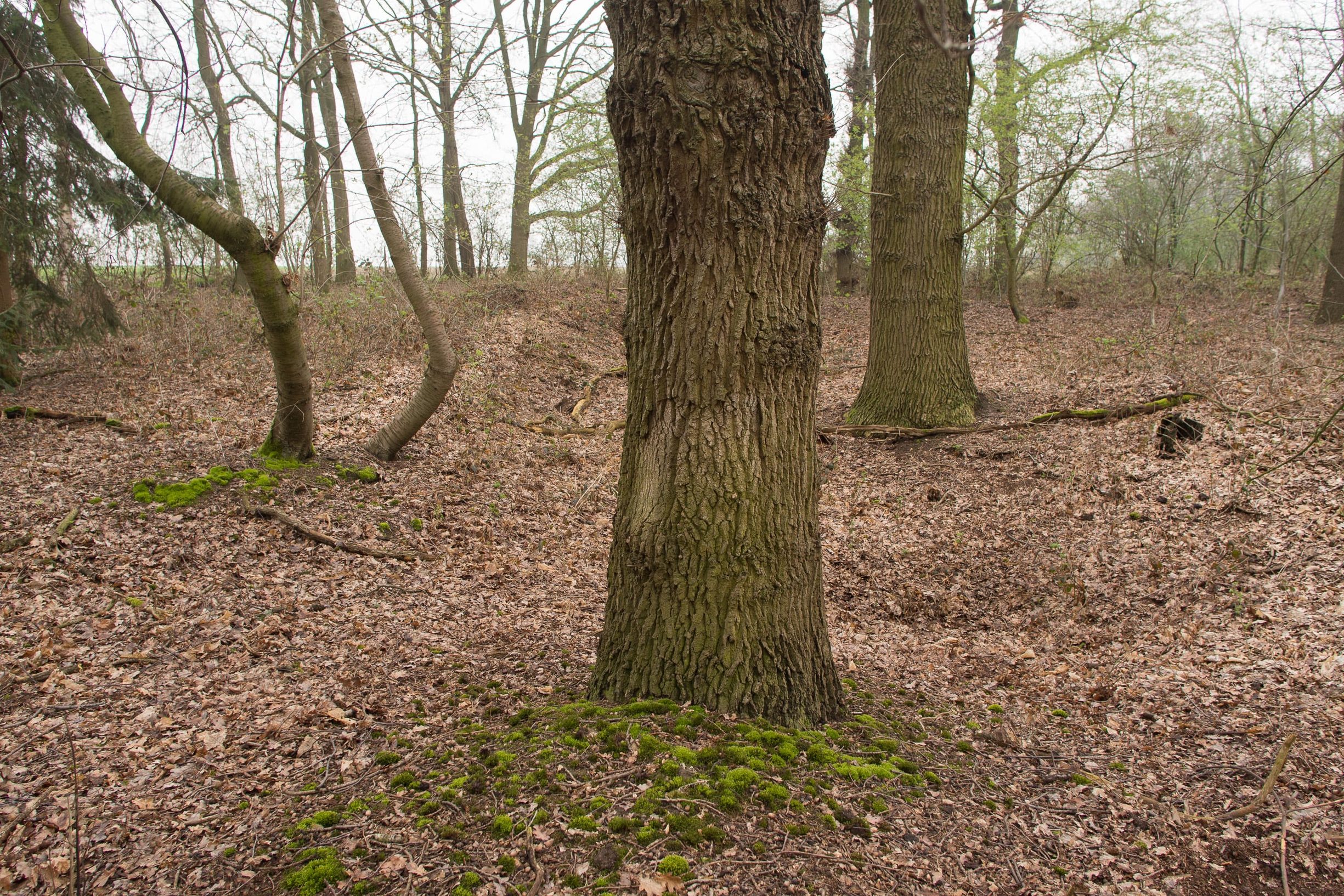 Ik was er in de vele jaren dat we in Schinveld wonen al meerdere keren samen met Lidy langs gefietst en steeds had ik het gevoel dat er in dit stuk bos ‘iets’ was, maar fietste dan weer verder. Op 4 augustus 2017 werd ik opnieuw tijdens een van mijn eerste lange wandelingen aangetrokken door deze plek en de bomen die me als verstilde aardetekens leken te roepen. Ik schreef die dag: “Ik loop het bos in omdat het silhouet van een eik en enkele ondiepe kuilen iets hoger op de helling me aantrekken. Is dit een ‘natuurtempel’ die ik nog niet ken? Ik zie een plek met minder ondergroei (‘Lichtung’) omringd door hoge eiken en tamme kastanjes, en in hun midden een tamme kastanje met liggende (!) hoofdstam die eerst twee verticale zijstammen heeft gevormd voordat hij met een bocht omhoog klimt, leunend tegen de stam van een eik.