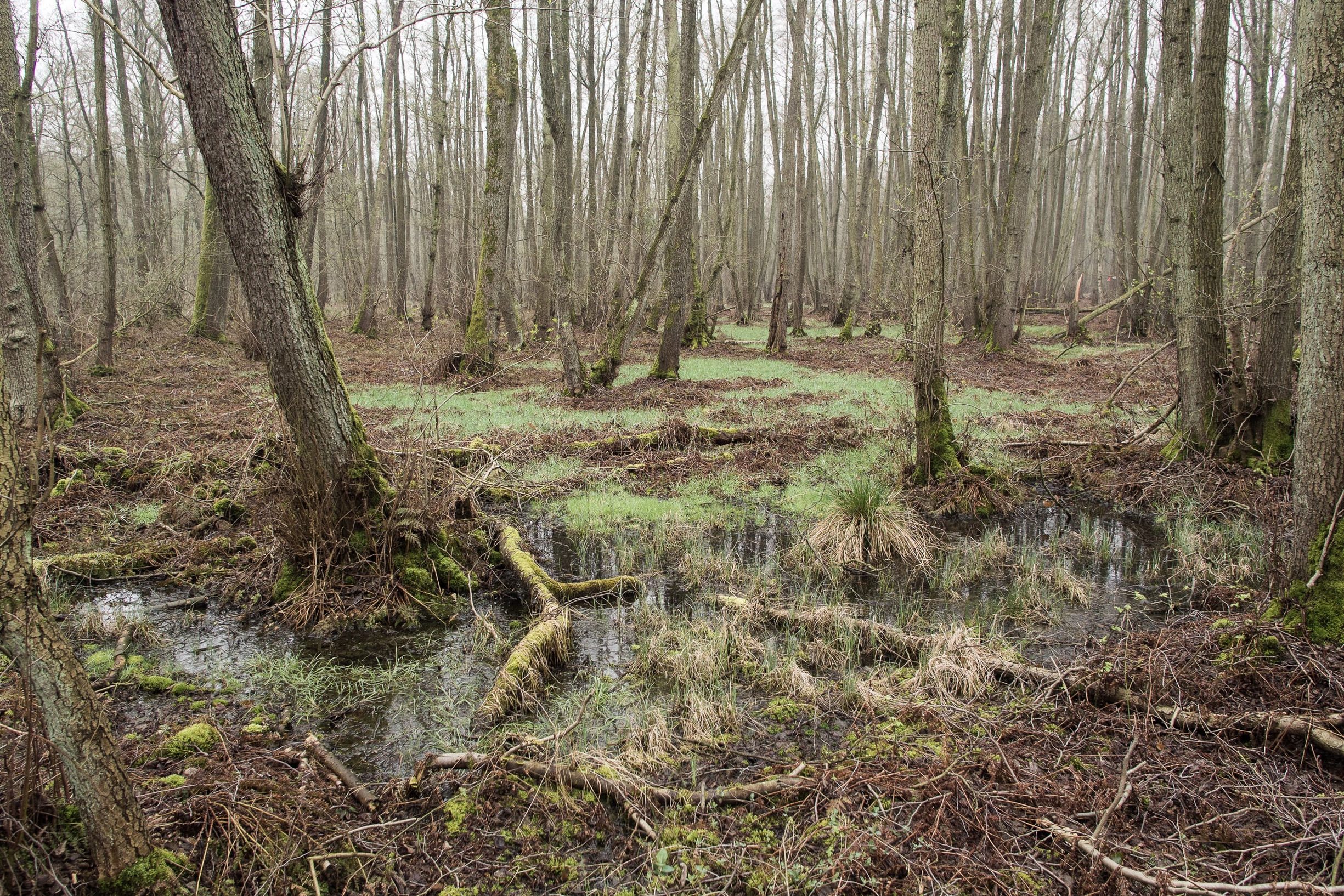 12 april 2018: Het is een volmaakte lentedag als ik over het lange pad langs de Rode Beek naar het bos loop dat zich uitstrekt op de noordhelling van het Rode Beekdal tussen Süsterseel en Tüddern. Vandaag is alles ingetogen en zacht, de nog mistige atmosfeer, de gesluierde zon, de sluiers van lentegroen in de broekbossen. Stralend groen schiet uit de aarde en uit de boomknoppen. Het stroompje van de beek kabbelt continu naast me, in een iets lager tempo dan ik, maar aangezien ik af en toe stop om in het bos te kijken haalt het water me weer in zodat we , vermoed ik, gelijktijdig bij het grote elzenbroek bij Tüddern aankomen. Daar laat ik de beek links liggen om verder door het grote elzenbroek van het Tüdderner Venn te lopen. Ik loop het drassige bos in om er de sfeer te voelen. Ik maak foto’s van helder groene eilandjes van gras die fris afsteken tegen de nog grauwbruine bodem. Deze broekbossen zijn de enige nog overgebleven en onaangetaste oude bossen in het plaatselijk landschap.