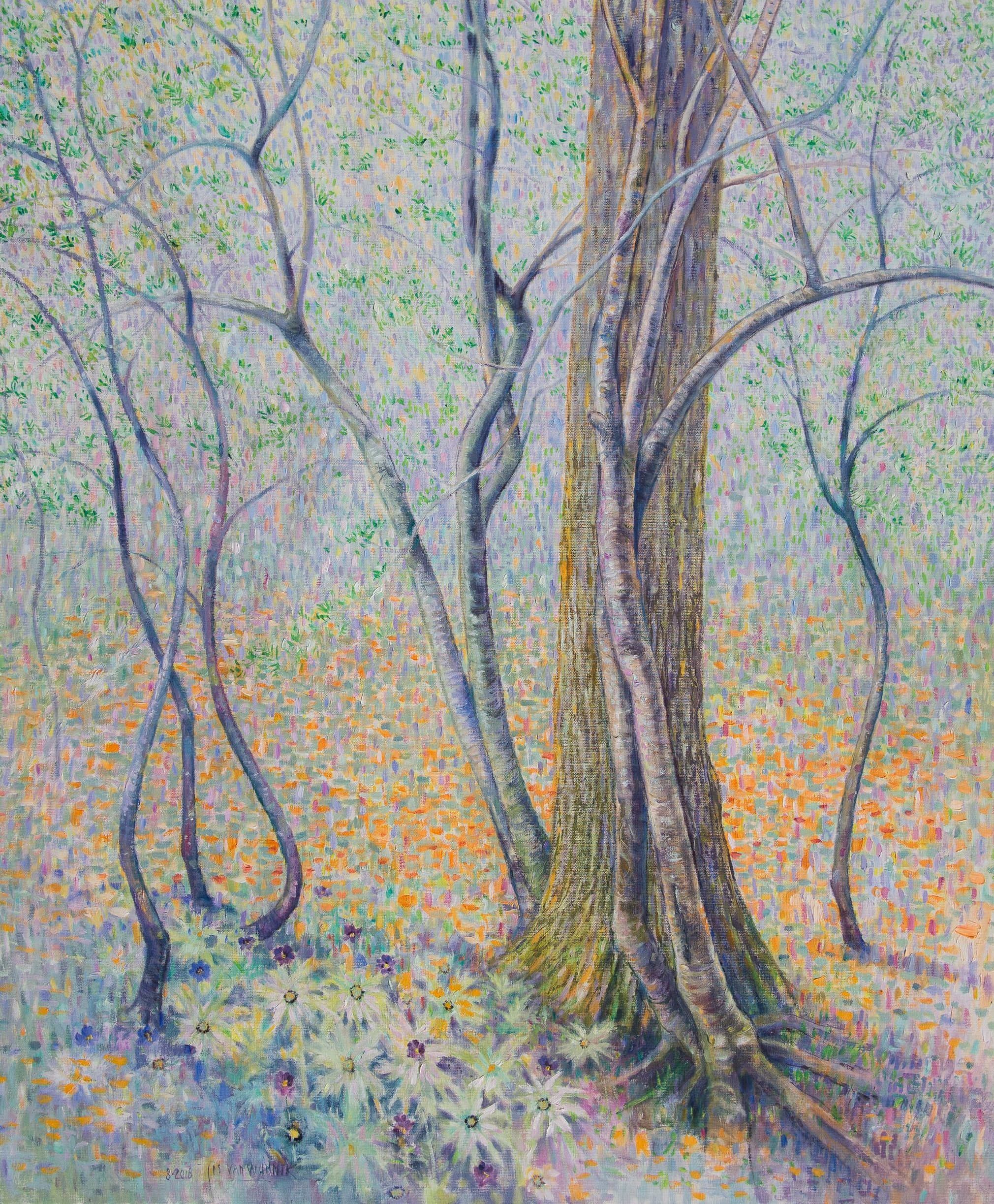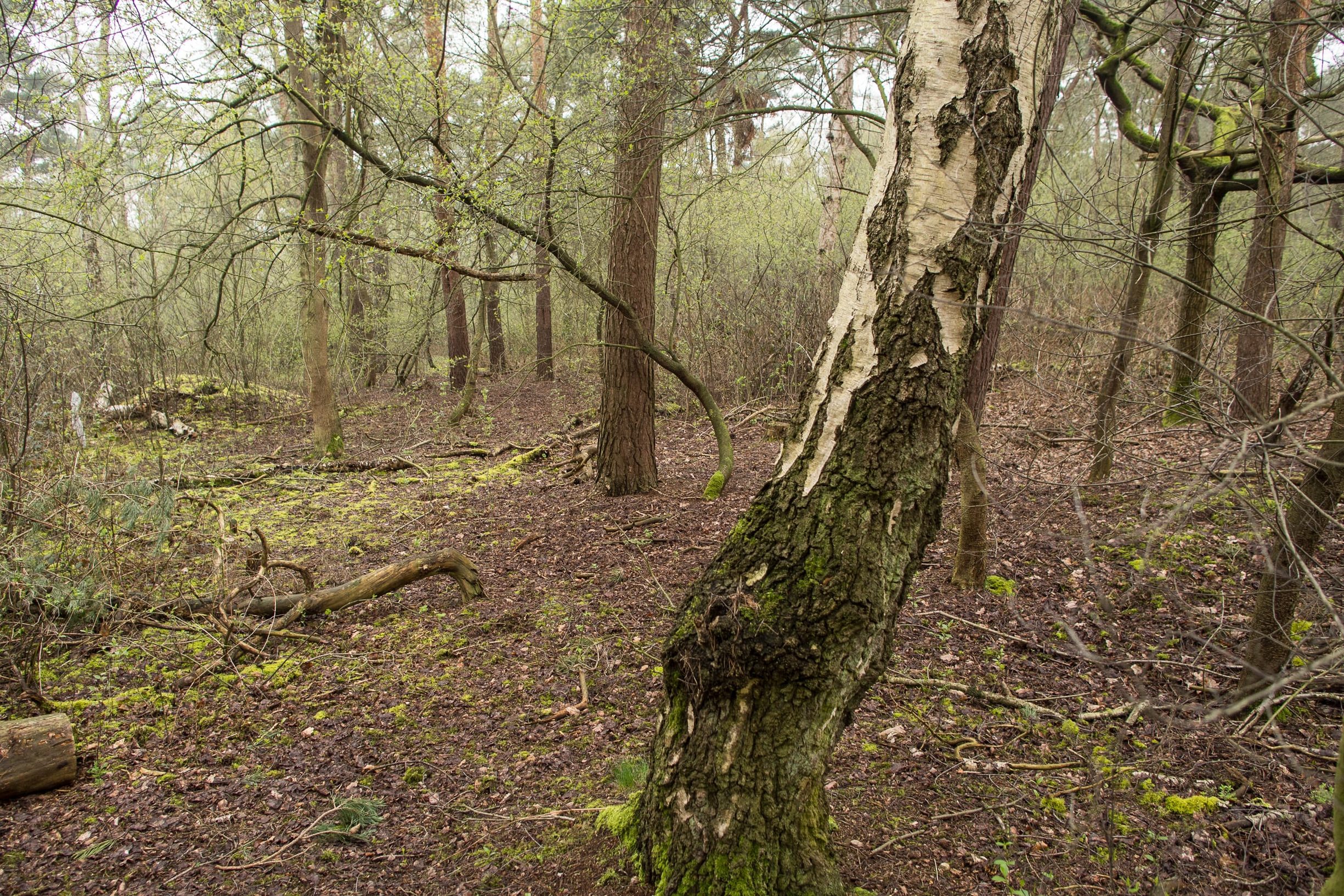 Ik ga tegen een boom zitten waarvan ik vermoed dat het de centrale eik is, en die geflankeerd wordt door twee lijsterbessen. Ik bewonder hun gladde, sierlijk gebogen takken en hun opvallende wortels. Ik voel van alles tegelijk — opwinding, heldere aandacht, blijdschap, het kind in mezelf.” Twee nachten lang voel ik daarna hoe de levensenergie (o.a. ‘warmte’) van de plek in me doorwerkt. Vandaag (12 april 2018) lokaliseer ik hier een Witte-plek, die zich precies tot aan de rand van een afgraving met jongere aanplant uitstrekt. Deze ervaring zal aanleiding zijn tot het maken van een schilderij, maar het duurt nog tot augustus voordat ik de innerlijke rust heb om een zuiver innerlijk beeld hiervan te schilderen.