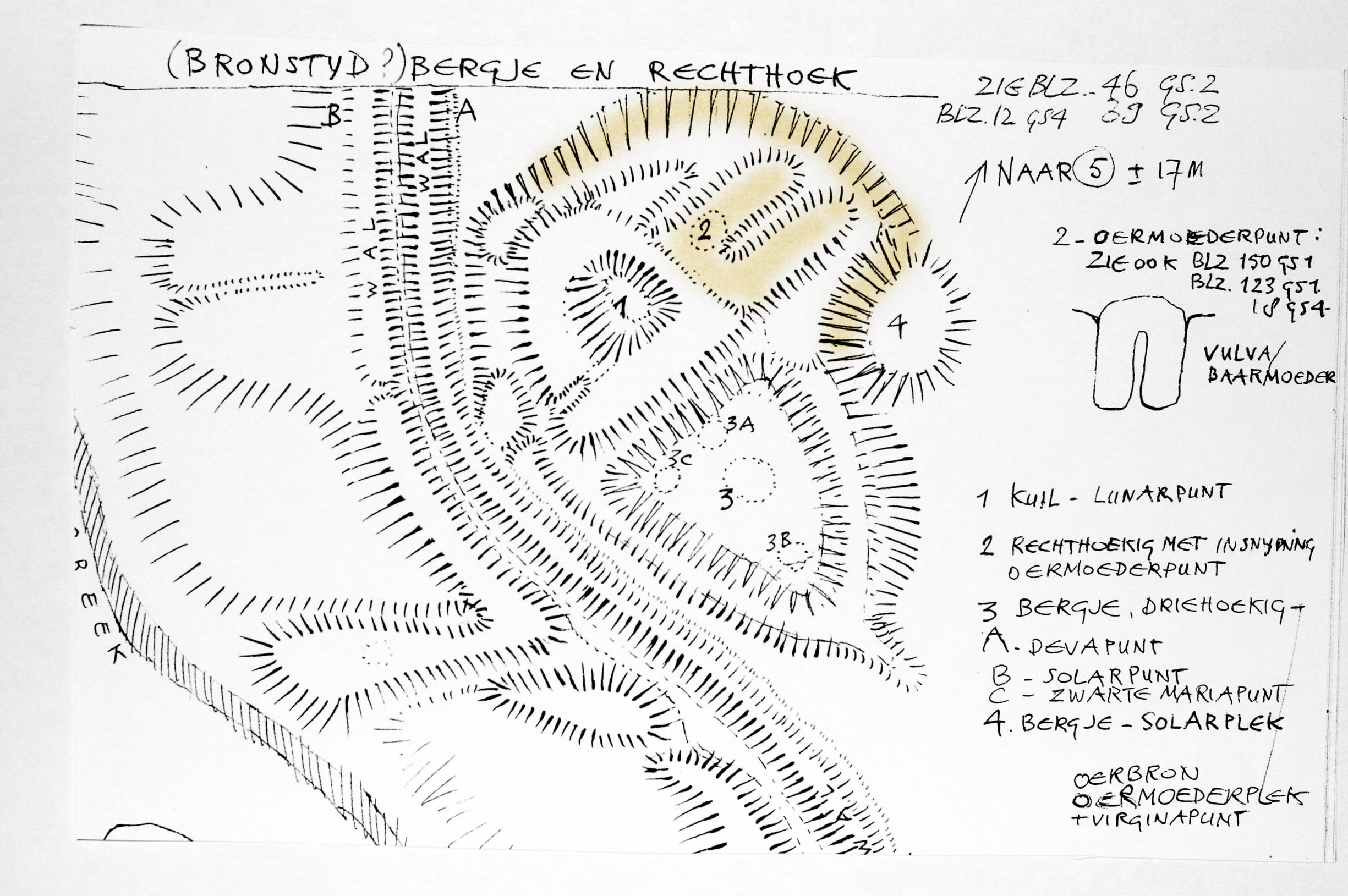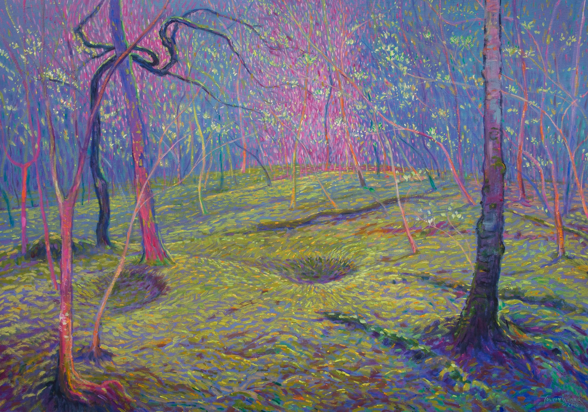 12 april 2018: Ik voel opnieuw dezelfde betovering als ik de besloten wereld van de overgangsheuvel betreed. De bodem is hier helemaal bedekt met zacht mos. Het pas ontloken groen en het mos licht op in het lage strijklicht, dat de vele kuilen beter zichtbaar maakt (ik tel er 25!). Er groeien vooral lijsterbessen en berken. Eén hoge berk valt op door zijn rechte, krachtige stam: de Zwarte-plek (van de oostelijke driehoek) test ik met de wichelroede. Het zwarte aspect van de drievoudige, vrouwelijke cyclus van groei, verbonden met de transformerende krachten van de aarde. Maar er is hier ook een lichtere, engelachtige aanwezigheid voelbaar, die versterkt wordt door het tere groen beschenen door het lentelicht. Als ik mijn ogen sluit zie ik veel roze. Pas twee weken later, als ik met Lidy aan tafel zit, met het nieuwe schilderij van de ‘Wendingsheuvel’ op de achtergrond in de maak, dringt het tot me door: dit is een nieuwe Michaëlplek die ik voelde op het hoogste punt van de heuvel (kleuren: lichtpaars, roze, zacht grijsgroen; op de plattegrond gemarkeerd met rozerood).