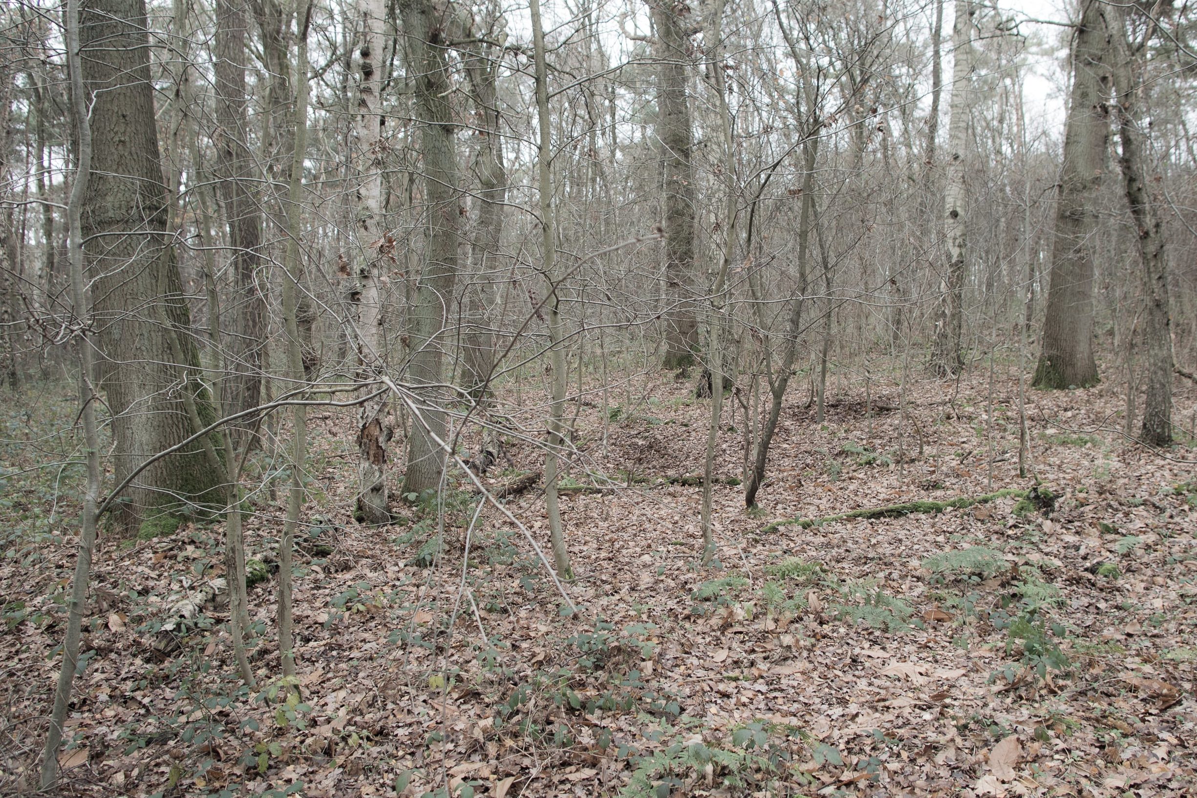 9 december 2017: Er waait een gure noord-oostenwind als ik het hellingbos bij Tüddern voor de derde maal bezoek, sinds ik met dit project begon. Ik voel een fijne betovering bij het betreden van een heuvel, die zich in een driehoek van paden ten noorden van de visvijvers bevindt. Het lijkt een wereld op zich. Het voelt alsof de plek hier al 2000 jaren onaangeroerd ligt. Misschien dienden de vele kuilen die over de heuvel verspreid liggen, in de IJzertijd als overgangsplekken om de overledenen in te leggen. Naast de heuvel valt me een greppel of verdiept paadje op. Op de kaart zie ik dat dit pad in zuid-oostelijke richting loopt waar zich een IJzertijd-grafveld bevond op de plek waar nu twee visvijvers in een diepe groeve liggen. Werden op deze heuvel de lijken afgelegd voordat ze via dit pad naar het grafveld werden gebracht?