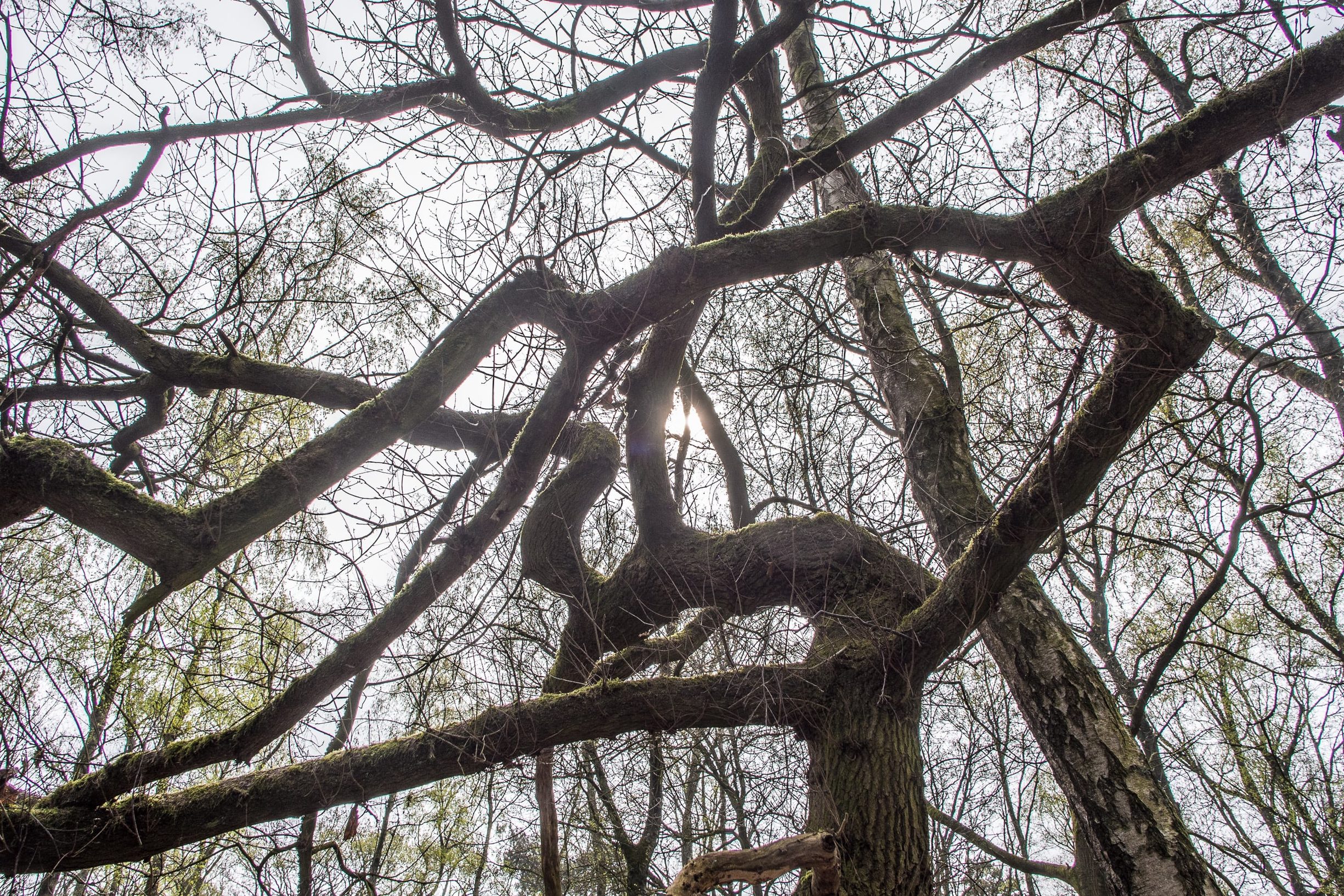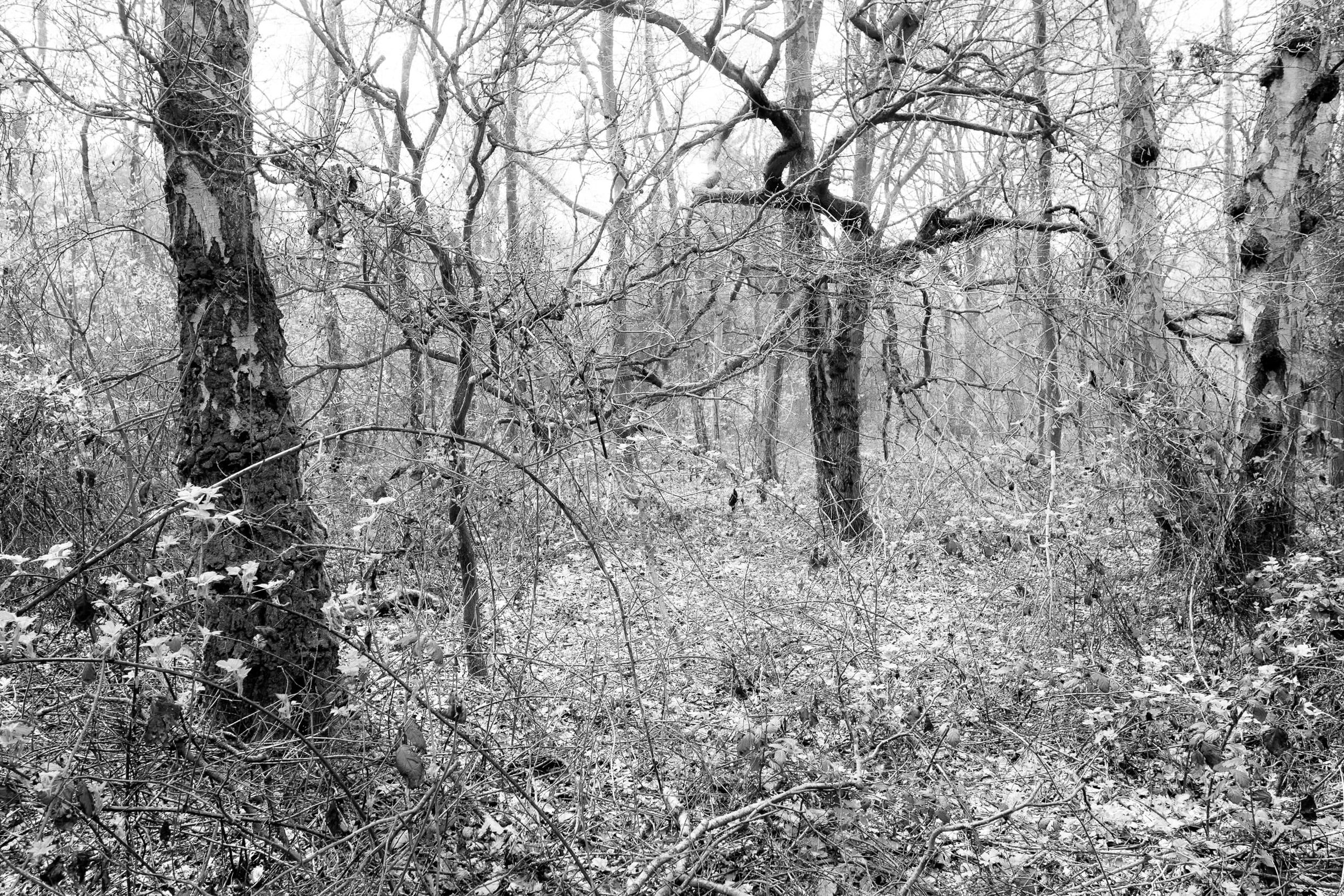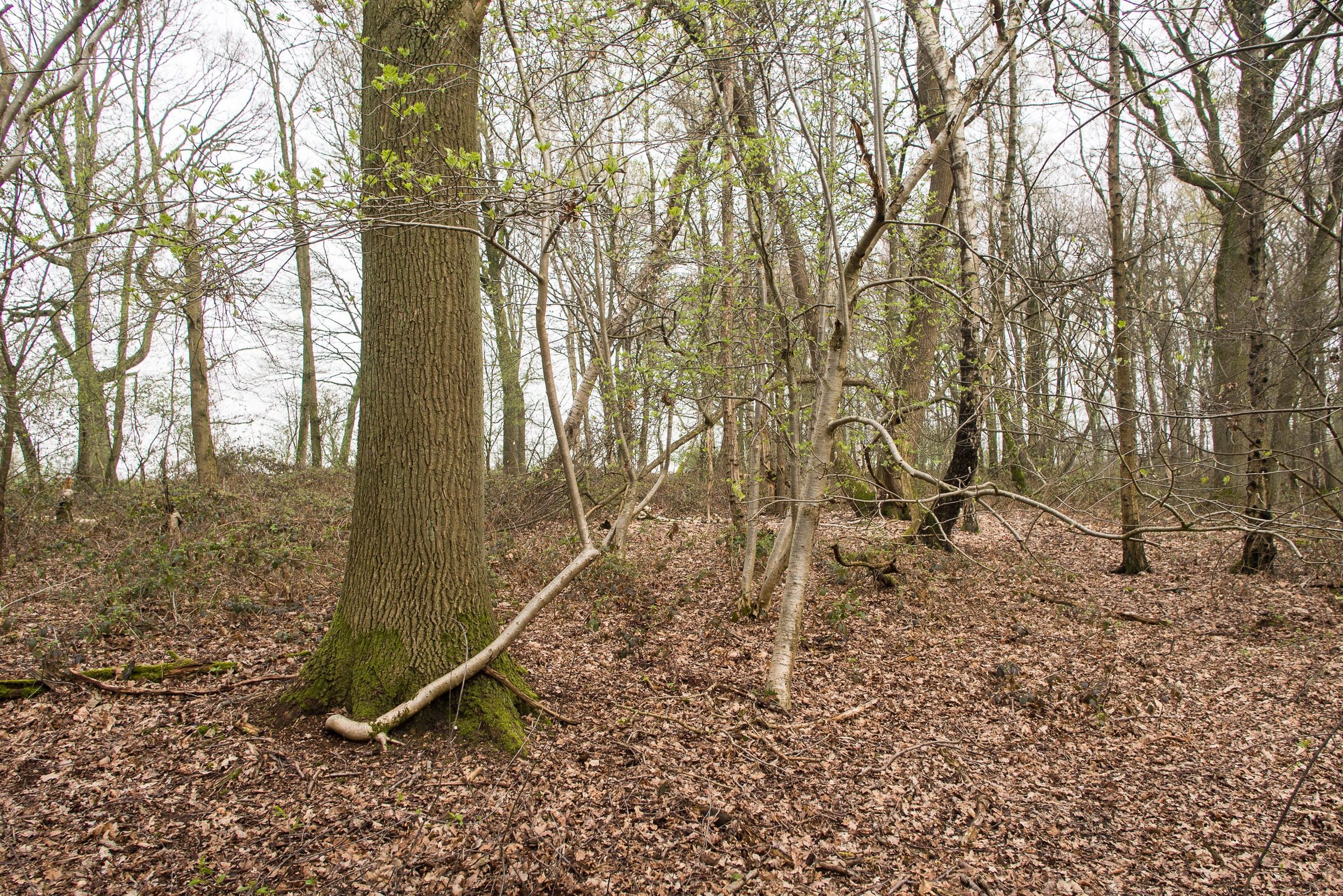 Vanaf de vijfsprong bij de overgangssheuvel volg ik een pad richting bosrand. Links van het pad ligt een grote afgraving met nog jong bos, rechts zie ik vlak voor de bosrand, terwijl mijn hart een sprongetje maakt, een plek met weinig ondergroei, enkele forse eiken en in de verte het spannende silhouet van een drie-stammige tamme kastanje. Ik ga in de kom tussen de drie stammen van de tamme kastanje zitten en laat de aanraking van de plek over me heen komen. Dan loop ik heel langzaam van boom naar boom en lokaliseer ik er de Witte-plek van de oostelijke driehoek bij een eik met vlak ernaast een lijsterbes die zich met een bocht rond de eik draait.
