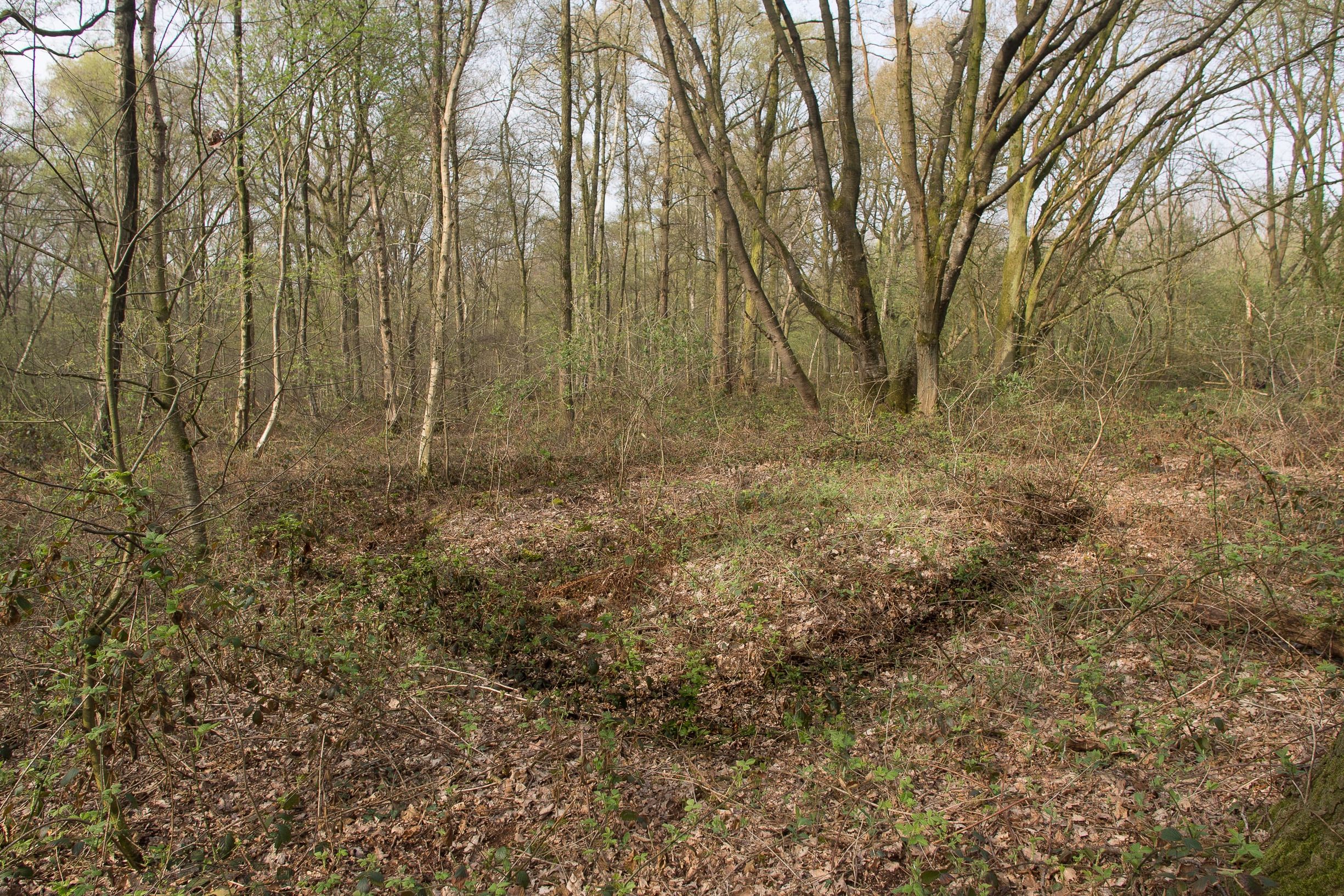 14 april 2018: De Rode-plek van de oostelijke driehoek heb ik nog steeds niet gevonden. Dus ga ik opnieuw op zoek naar dit nog ontbrekende derde hoekpunt. Op ‘Maps’ zag ik al enkele grote boomkruinen aan de noordrand van het bos grenzend aan een rechthoekige inham. Aanvankelijk zoek ik teveel westelijk, waar ik wel een monumentale wilde kers vind en een u-vormige greppel en wal. Een vrouwencultus- of Lunarplek? Soortgelijke, kleine u-vormige aardwerken vond ik al eerder in het Schinveldse Bos en het Alleebusch.
