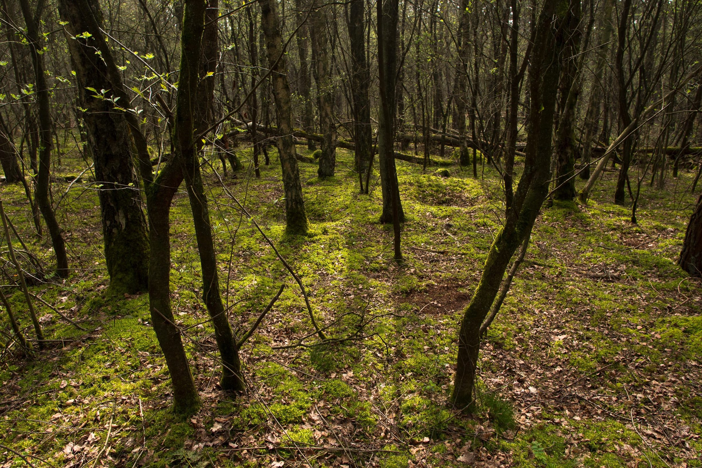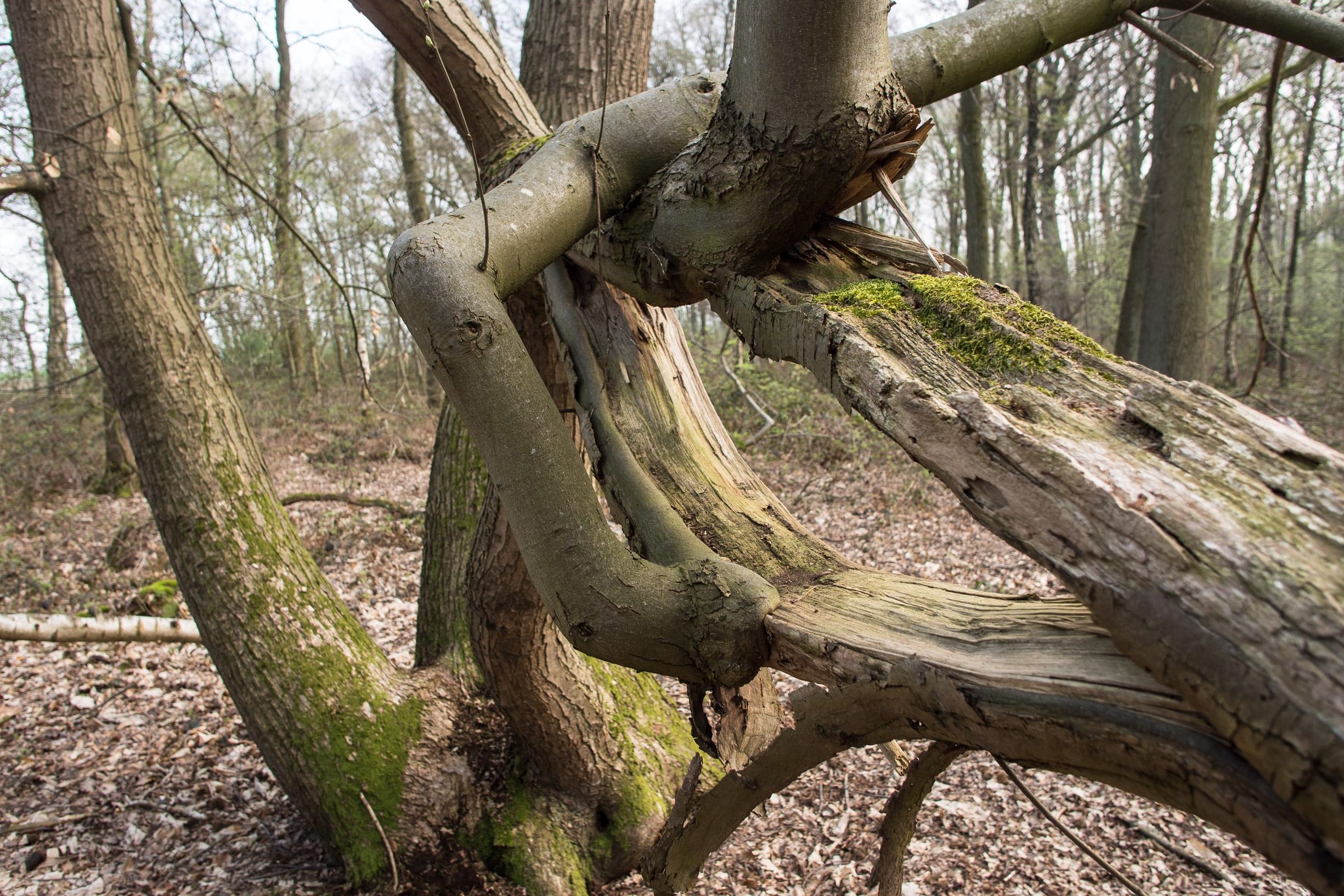 Op 9 december vond ik niet ver van de overgangssheuvel nog een derde plek, waarvan de gewijde sfeer me raakte. Ook hier weer weinig ondergroei, en opvallend veel lijsterbessen en enkele oude berken. Maar nu ik deze plek opnieuw bezoek, lijkt het alsof hij is verdwenen. Ik herken de plek niet meer. Tot mijn ontzetting zie ik hoe er onlangs ’onderhoud’ is gepleegd: diepe voren in de bosgrond, alle oude berken (bij een stronk ik tel 80 jaarringen) zijn geveld, waarbij tevens de meeste lijsterbessen omver zijn gewalst. Eén groepje lijsterbessen is gespaard gebleven. Waarom juist deze plek, terwijl overal rondom niets is gekapt? Terwijl ik ontdaan door deze ravage rondloop wijst de wichelroede een Michaëlplek aan, die deel uitmaakt van de oostelijke driehoek, maar ik ben te onrustig om er stil te blijven staan.