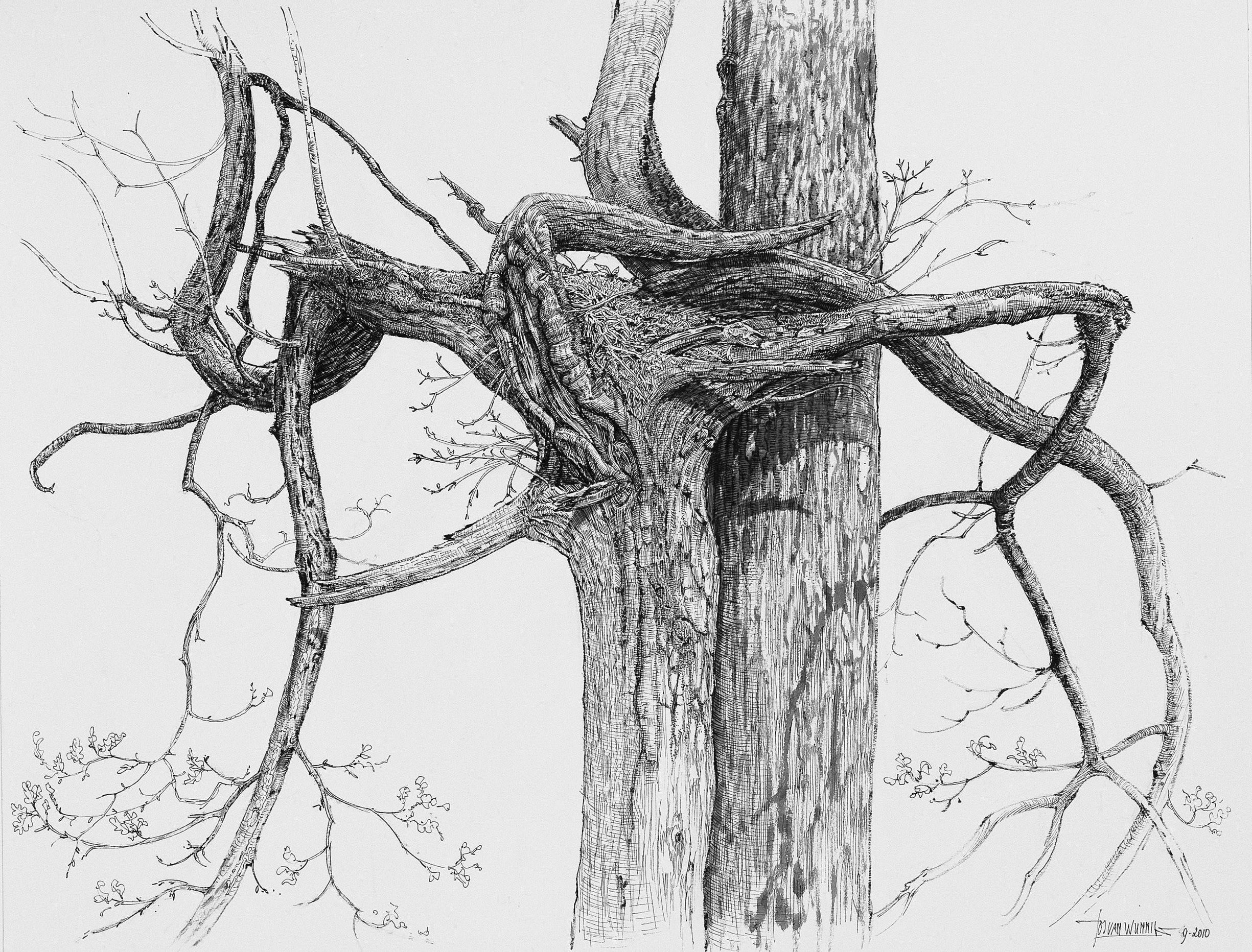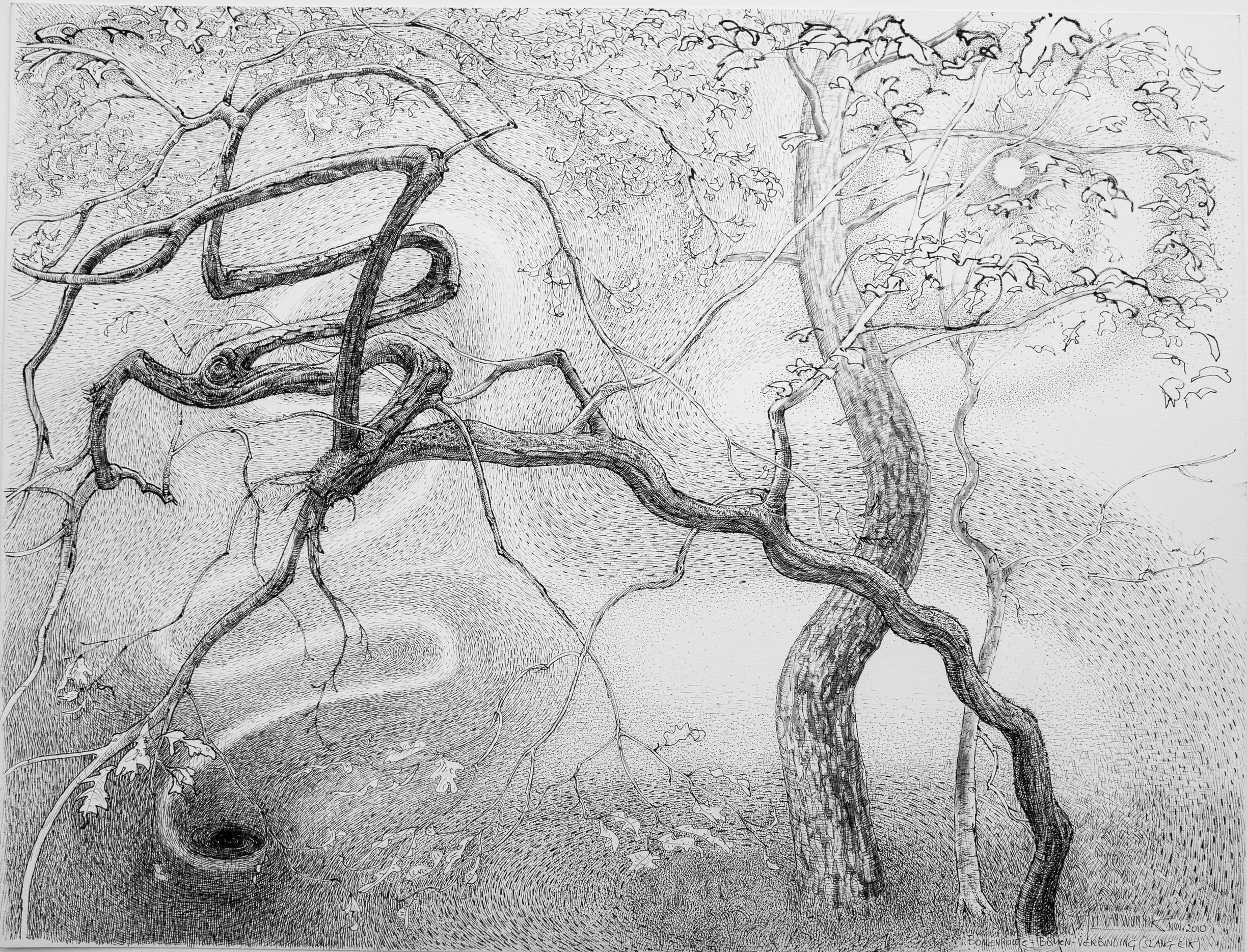 Vervolgens vind ik mijn inspiratie vooral in de Schinveldse Bossen en maak ik tussen 2003 en 2014 verschillende series met takken, bomen en stronken (‘Stroomhout’, ‘Bronbos’, ‘Stroombos’, ‘Stroom, geworteld’). Ook maak ik in 2010 een serie pentekeningen van bomen op krachtplekken met bijbehorend boekje met gedichten en een wandelroute met als titel ‘Bomen, verbinding’.