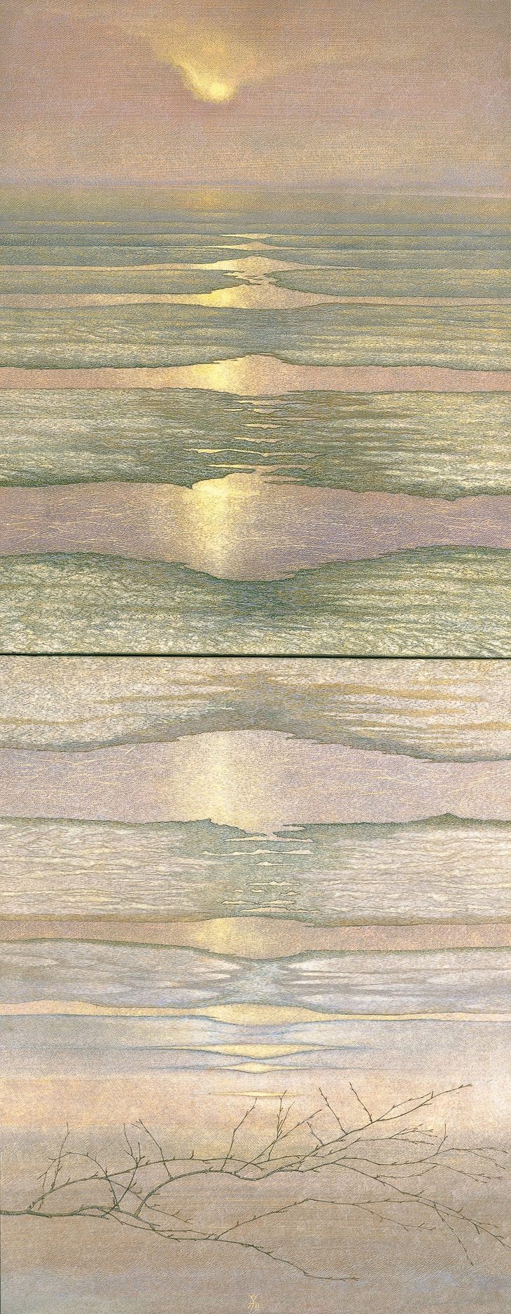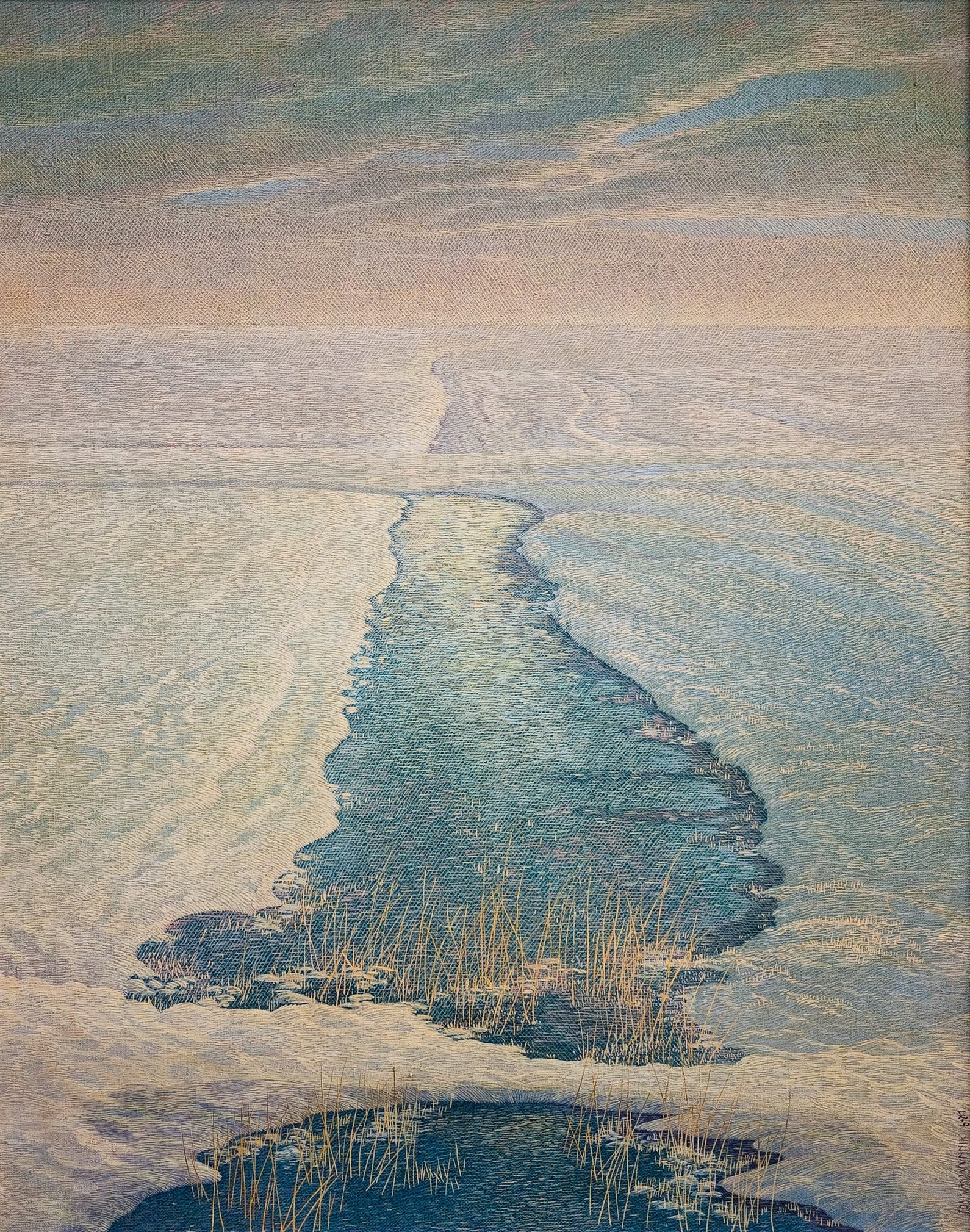 Ik schilder het glanzen en spiegelen van licht op ijs, maar tevens het spiegelen van het waargenomen beeld in een tweede, verinnerlijkt beeld, het ‘verticale landschap’. De herinnering aan een serene, tijdloze ruimte in mezelf?