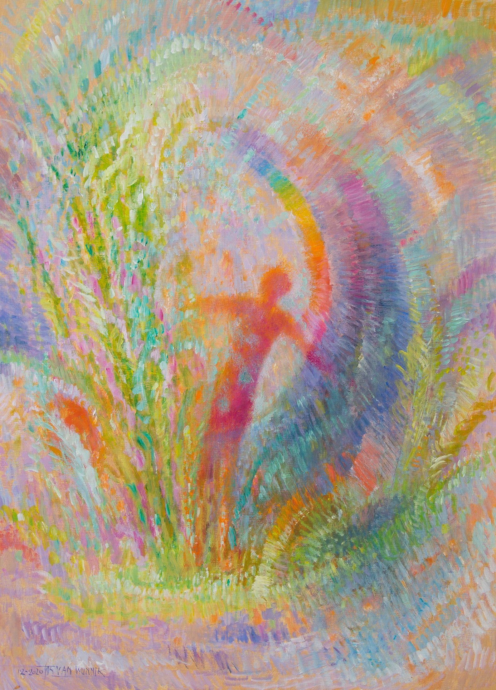 Na een lange periode van herstel ervaar ik aan den lijve hoe deze levenskracht en scheppingskracht op een nacht weer in me stroomt, en zich vertaalt in de onontkoombare drang om dit te schilderen. Het schilderij dat hieruit ontstaat kenmerkt zich door het ontbreken van afgebakende vormen, en kleurvlekjes als trillende vlindervleugels. Alles ontkiemt en resoneert met elkaar in een ronde ruimte.