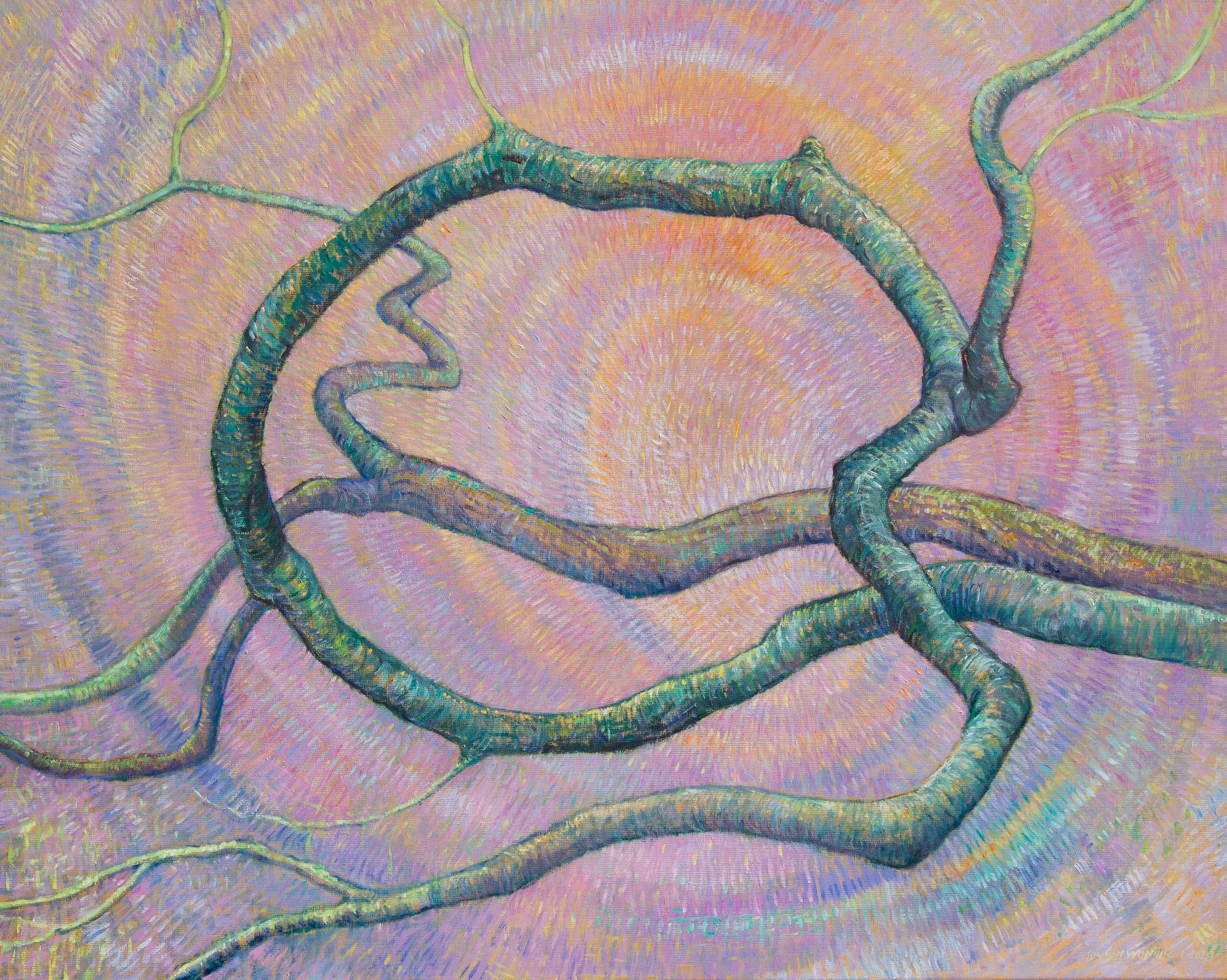 Ik verkeerde in de veronderstelling dat ik inmiddels wel genoeg bomen en takken had geschilderd. Tussen de enorme hoeveelheid van mijn verzameling foto’s van bomen met opvallende groeivormen vind ik maar één die een bijna geheel cirkelvormige ronding maakt. In de achtergrond schilder ik een stralende cirkel/ovaal, die de eenheid uitdrukt van waaruit alle groeivormen ontstaan…Viriditas.