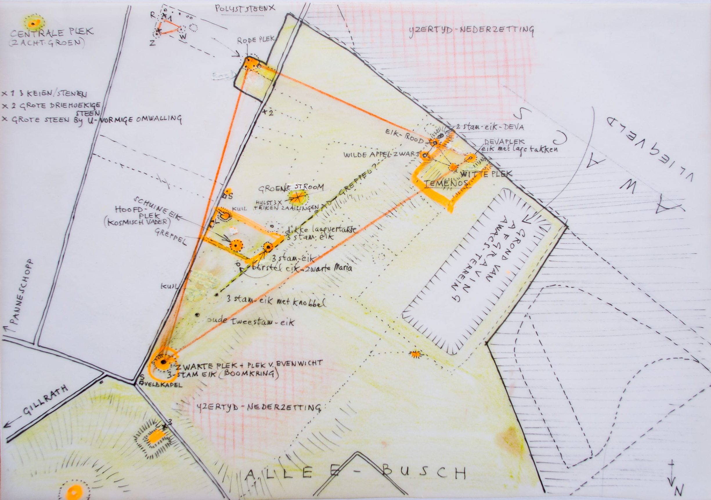 Further on, nearby the gate of the militairy area, I pass the second place with three old pine trees. A quit different atmosphere here, sunny, open (red goddess place) and a elongated mound (solar place). A hundred meter further I reach the third place of power. I study the series of holes and little mounds and enjoy the subtle energy.