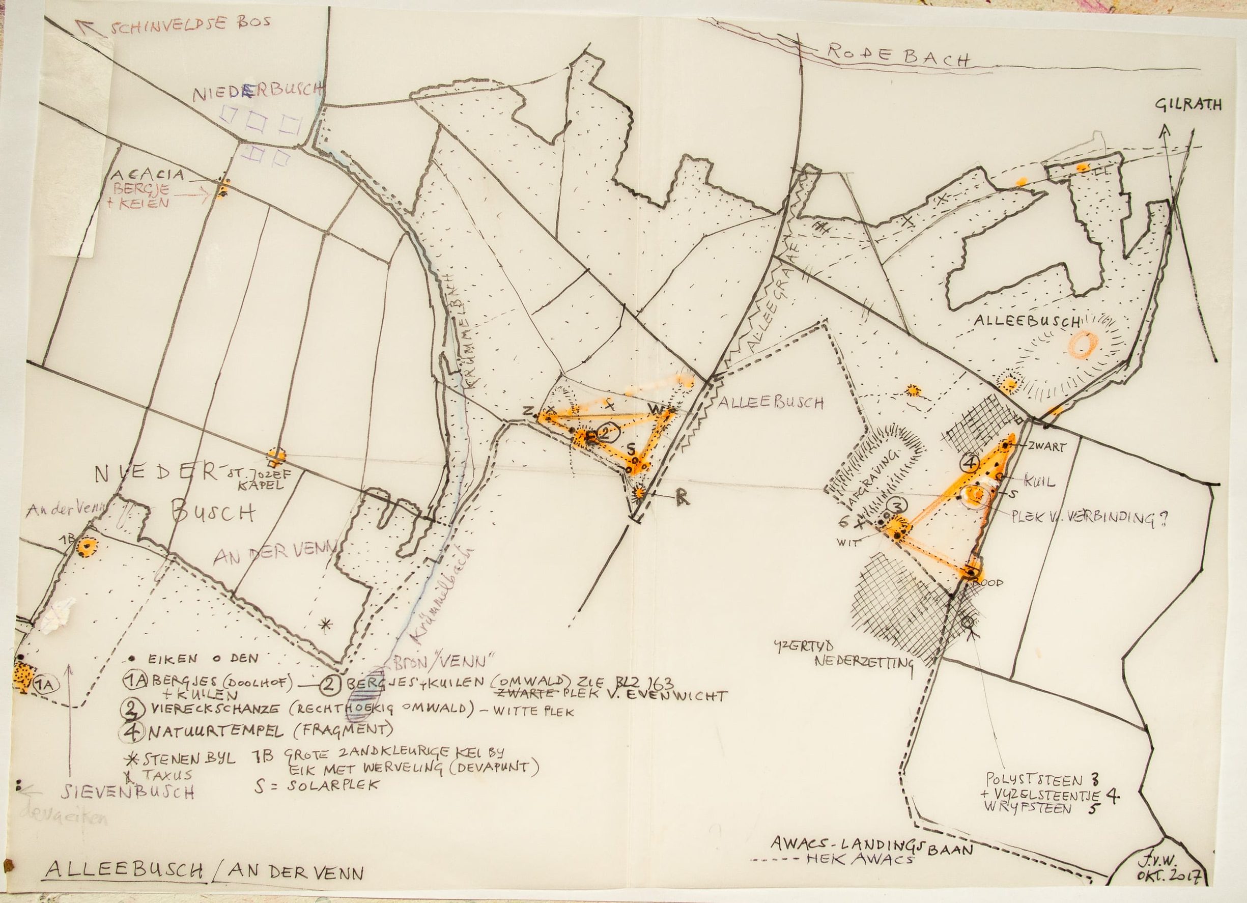 May 21, 2024: Today I take it a lot easier than i did six years ago: half of the distance Schinveld-Alleebusch I do cycling and from the German border I go on foot. I follow the forest path that runs parallel to the Krümelbach untill the fence of the militairy base. There for the first time an elongated hole and a small dignitary attracts my attention. I notice some characteristics of a place of power: less undergrowth, a birch with bigger extend, a strange chaped pine tree.